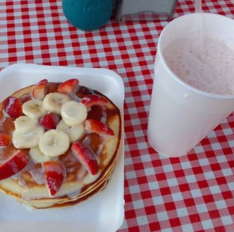 Hot Cakes con fruta (3) con fruta a elegir, Platano, manzana o fresa y Malteada de chocolate , platano o fresa de 20 onzas