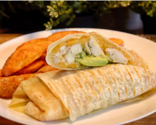 Tortilla de harina, queso, espinaca, aguacate y pollo al pesto.