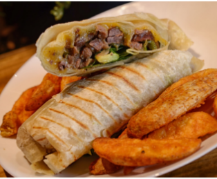 Tortilla de harina, queso, espinaca, aguacate y fajitas de res.