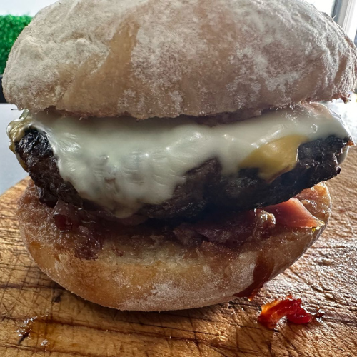 Hamburguesa de res en pan artesanal, salsa de tocino, tocino, bbq y queso suizo