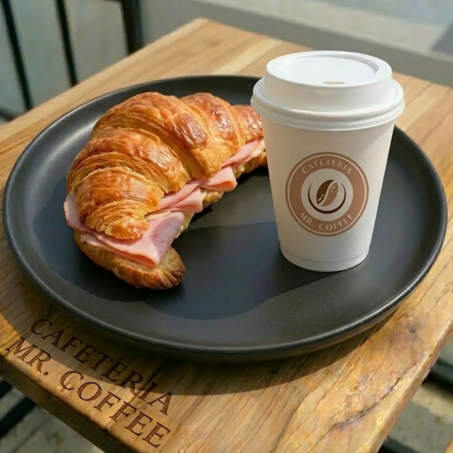 1 Cuernito preparado con jamón y un café americano en las rocas de 16 oz.