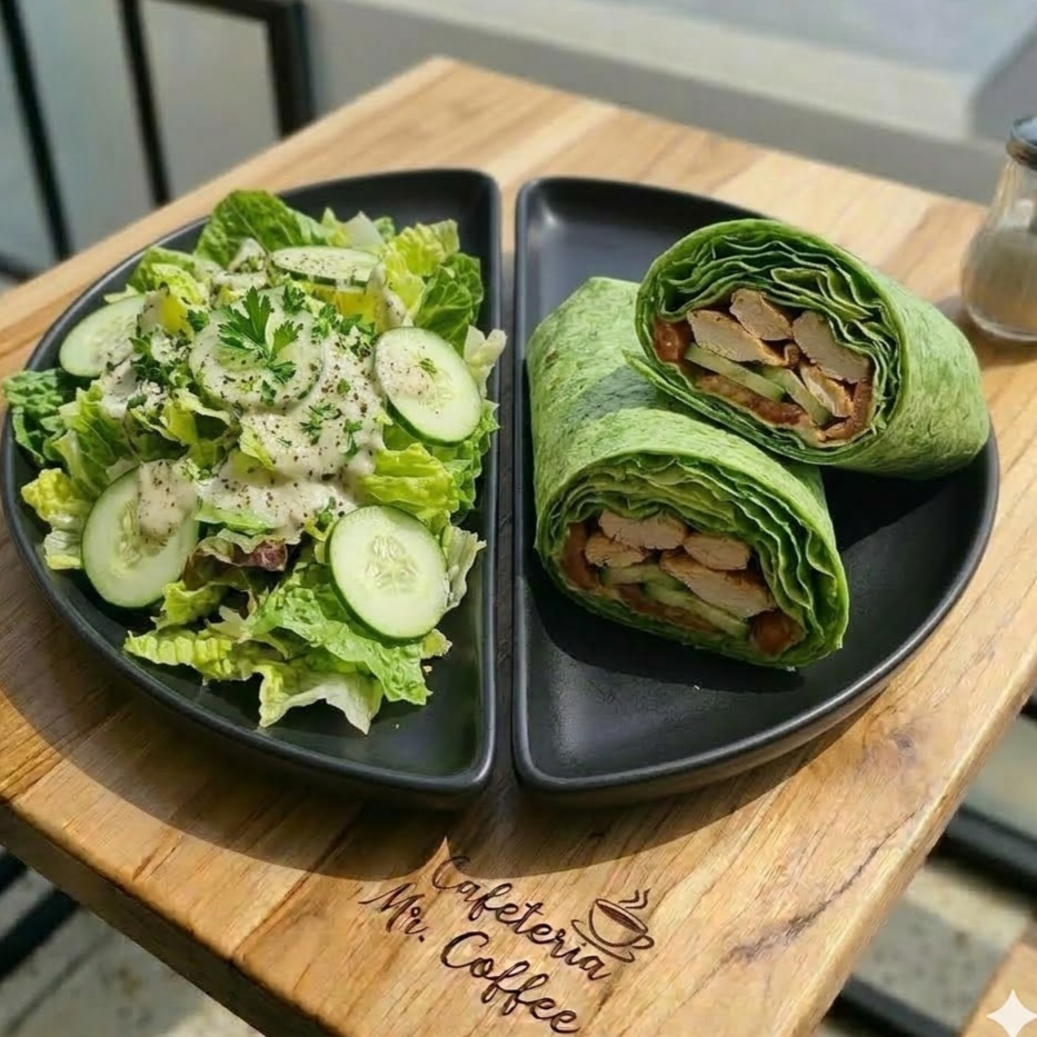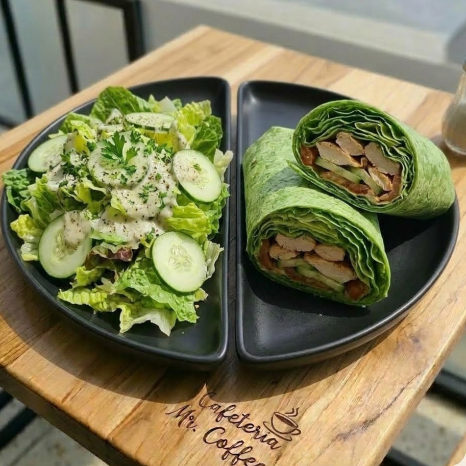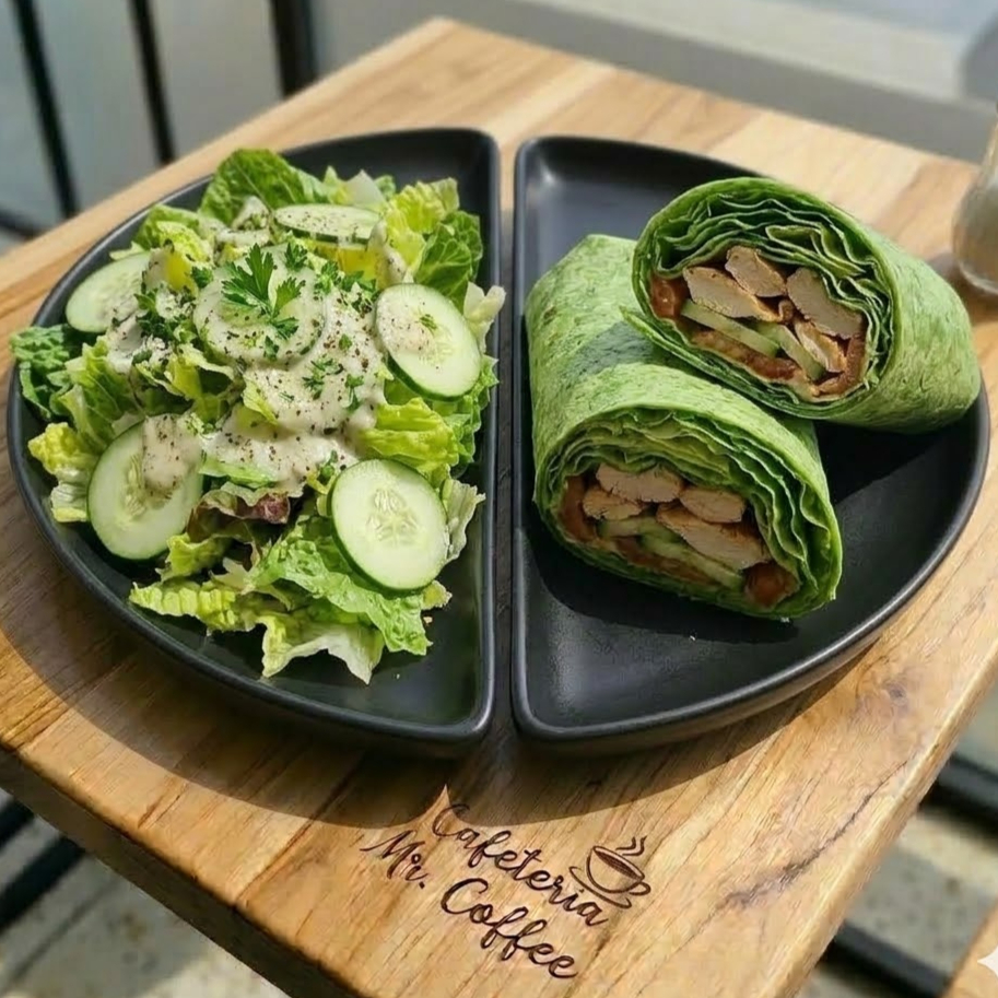 Ensalada: lechugas de temporada con pepino, tomate y pollo. Wraps: tortilla de integral o espinaca con lechugas de temporada, pepino, tomate y pollo.