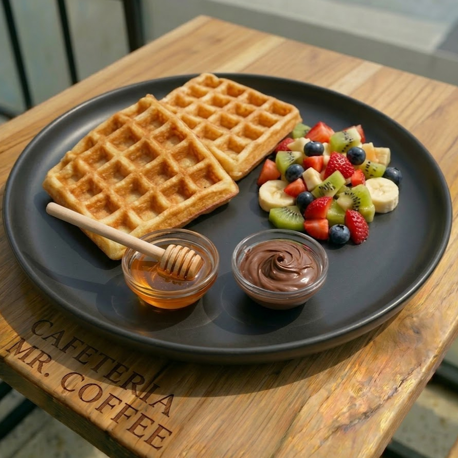 2 Waffle, incluye miel, mermelada y/o Nutella y porción de fruta picada.