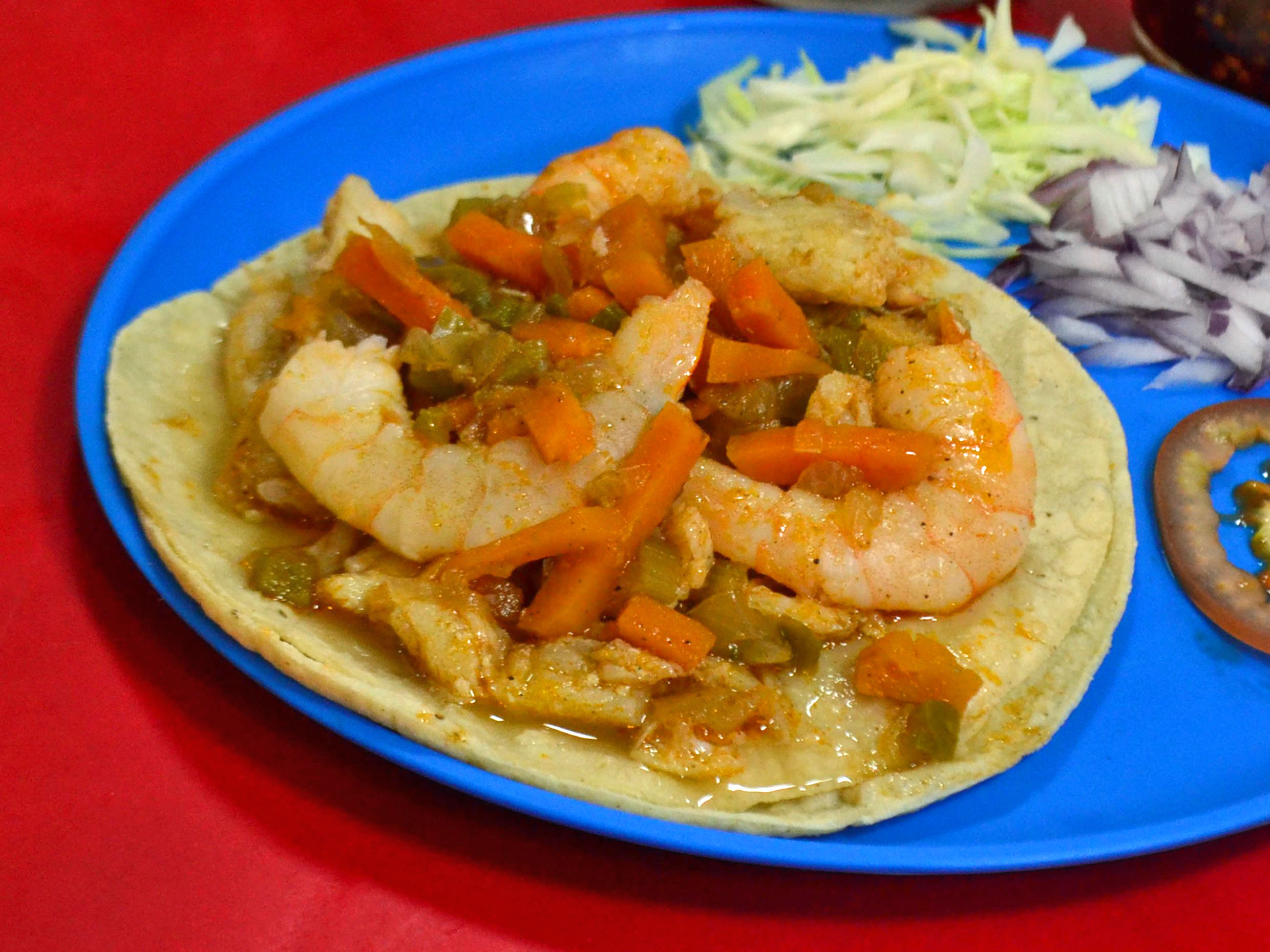Delicioso taco de manta y camarón.
