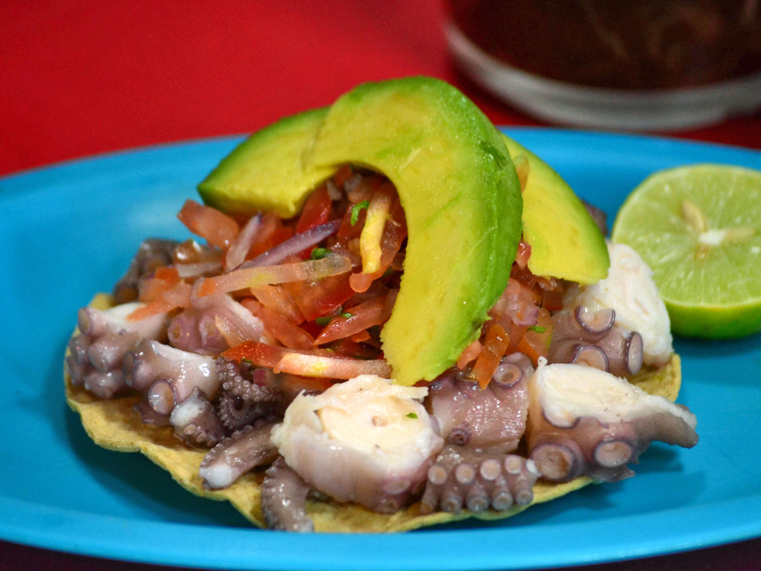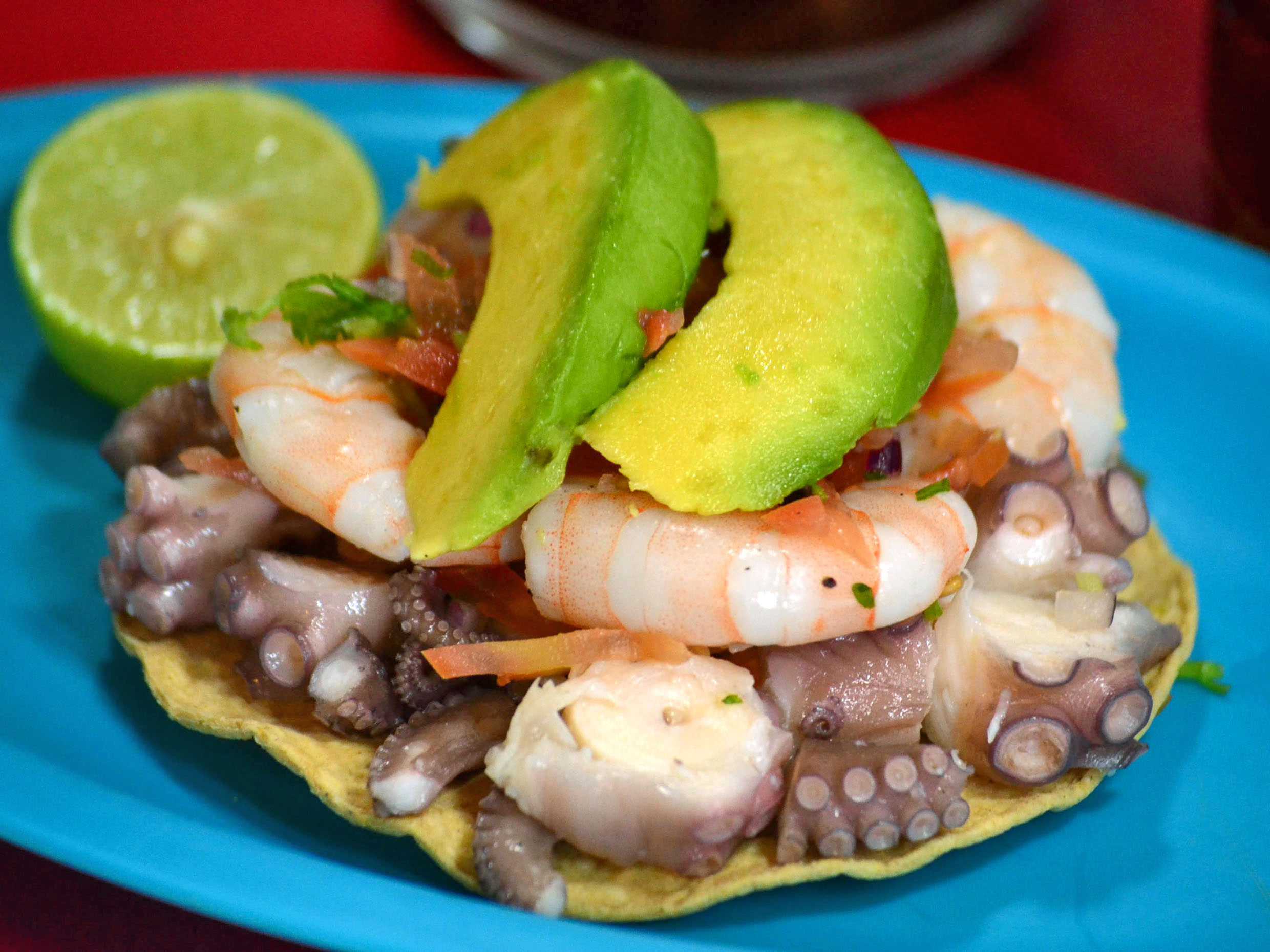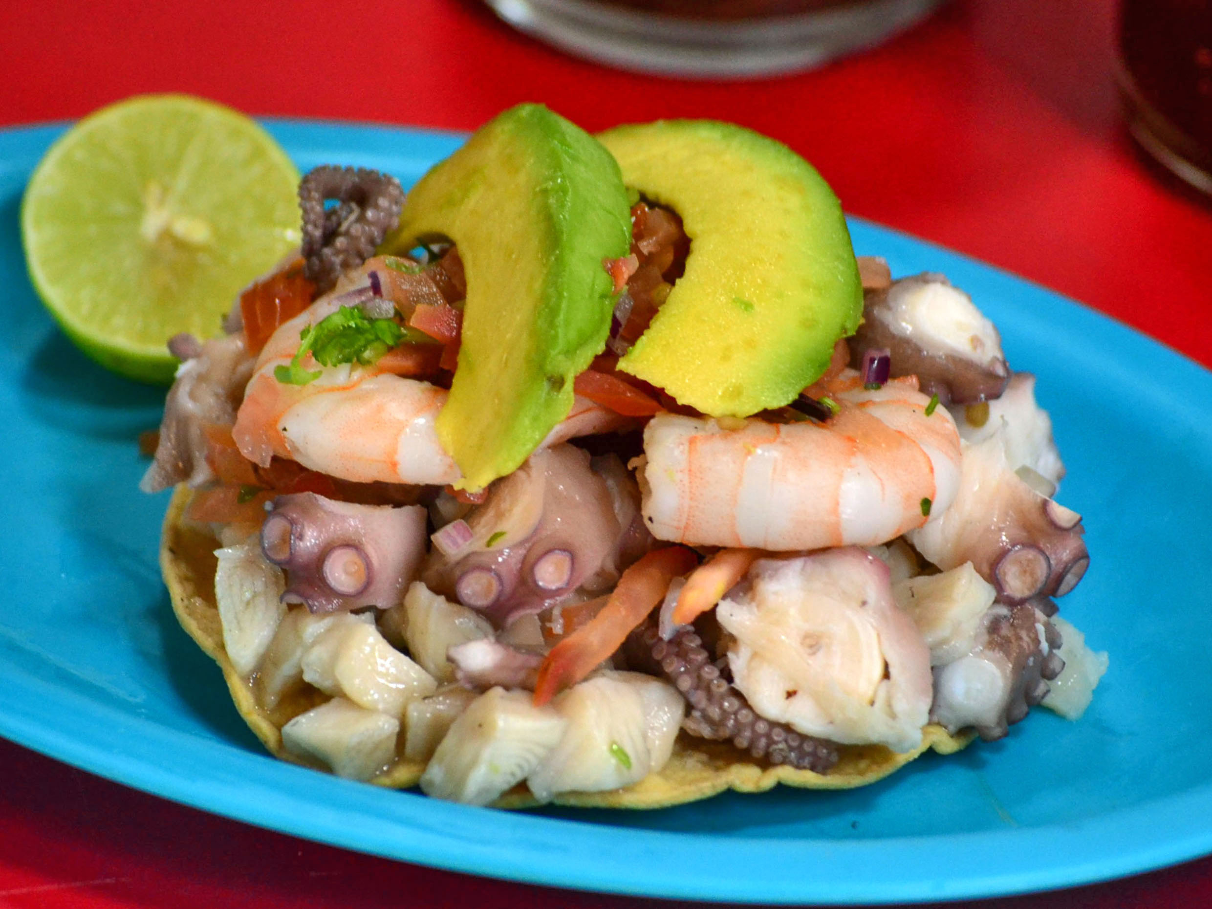 Ceviche de pescado, camarón y pulpo.