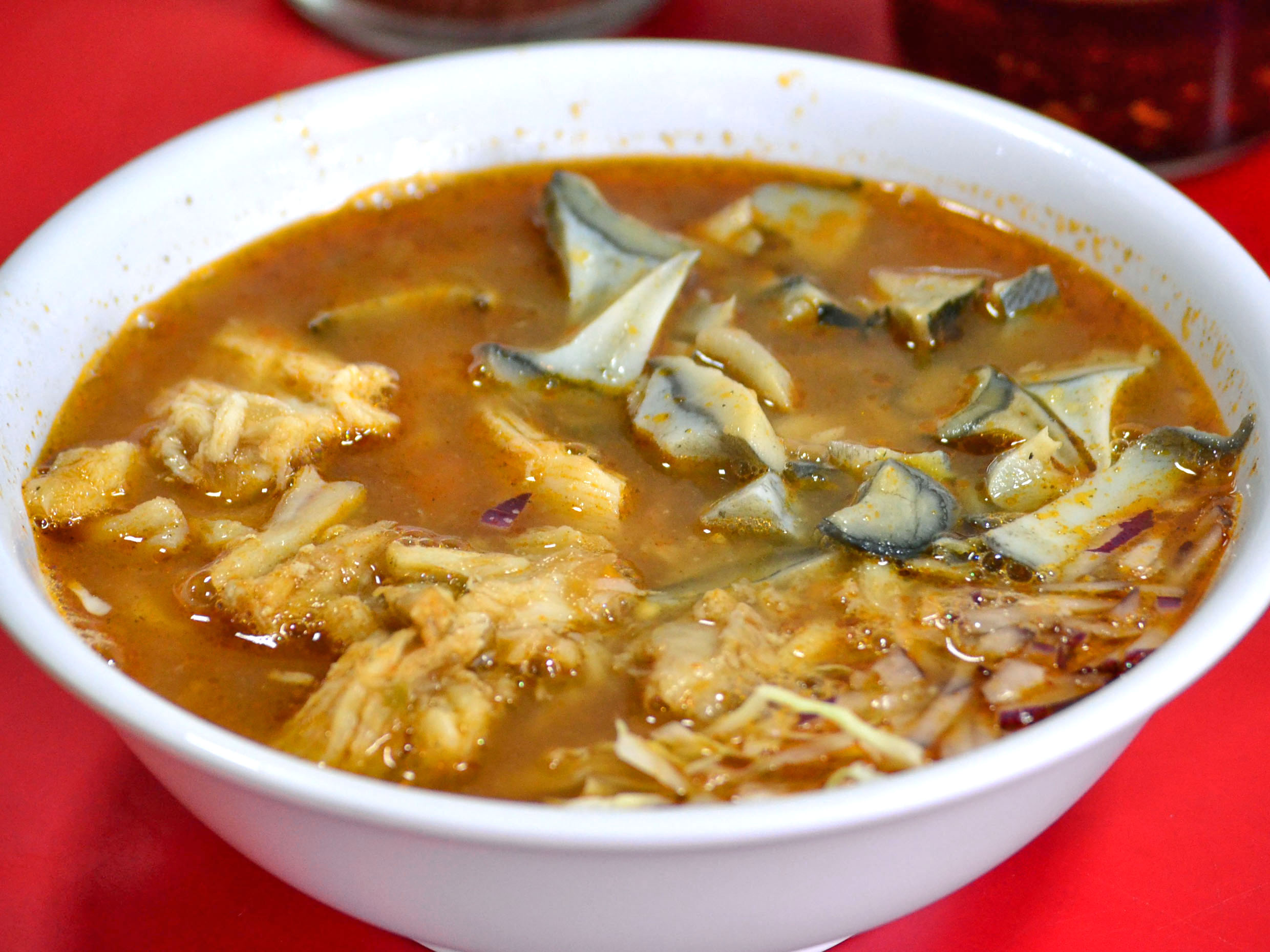 Delicioso caldo de camarón y aleta.