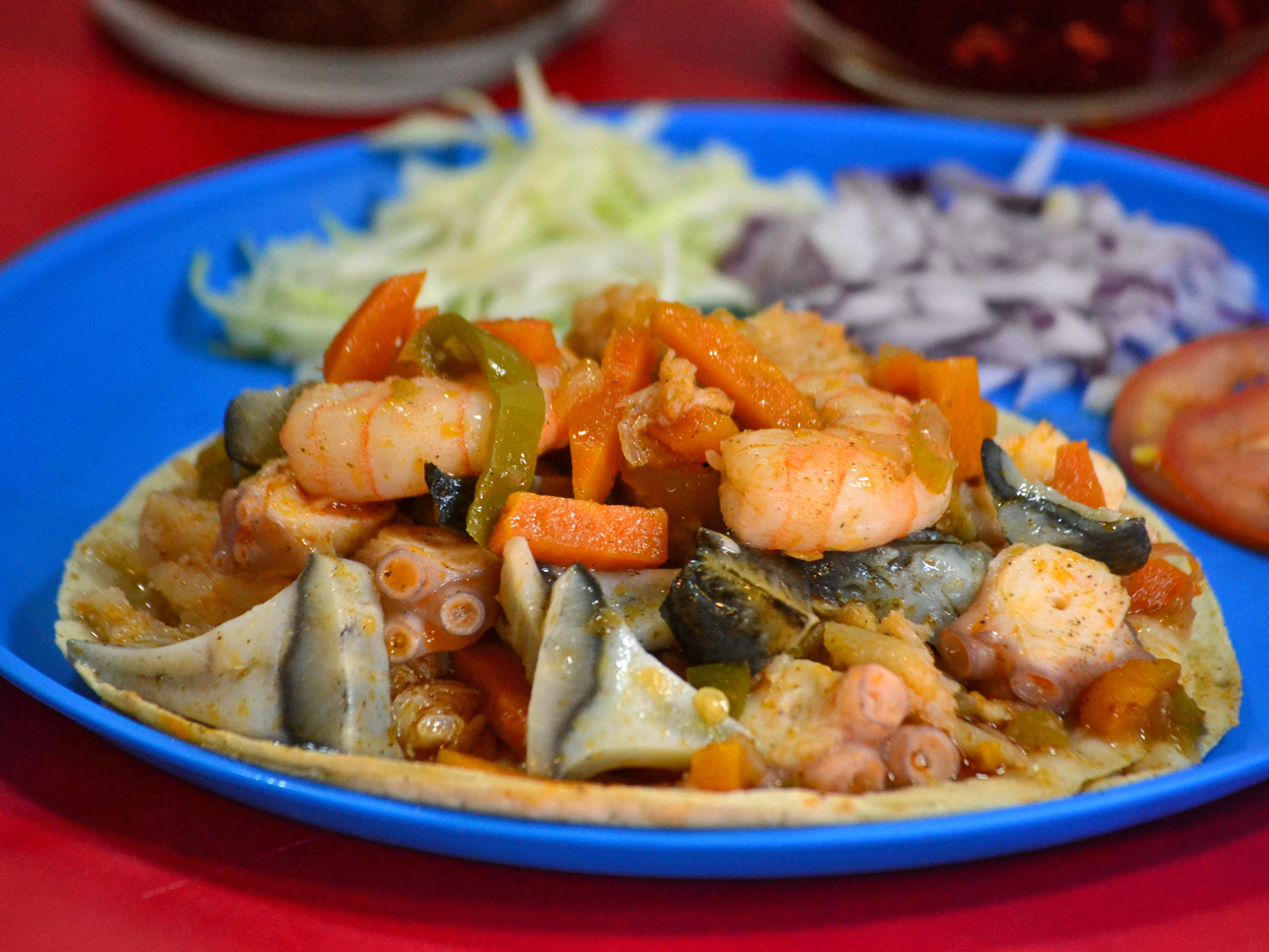 Delicioso taco de cahuamanta, camarón, pulpo y aleta.