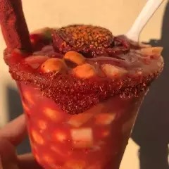 Cacahuate japonés, chaca chaca, pepino, jícama, cueritos, clamato, chile, chamoy y limón.