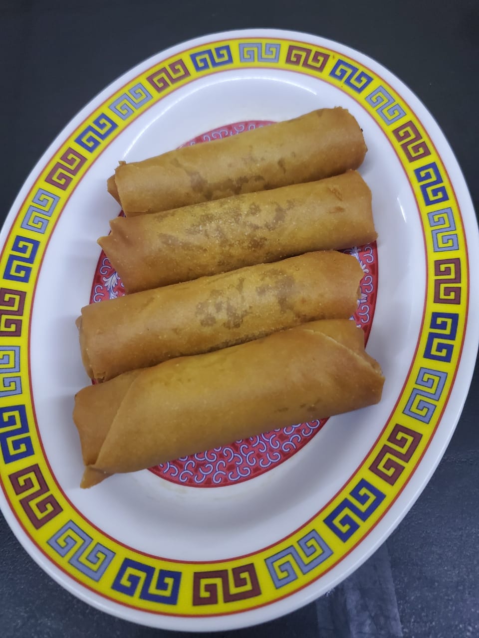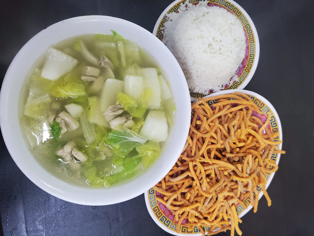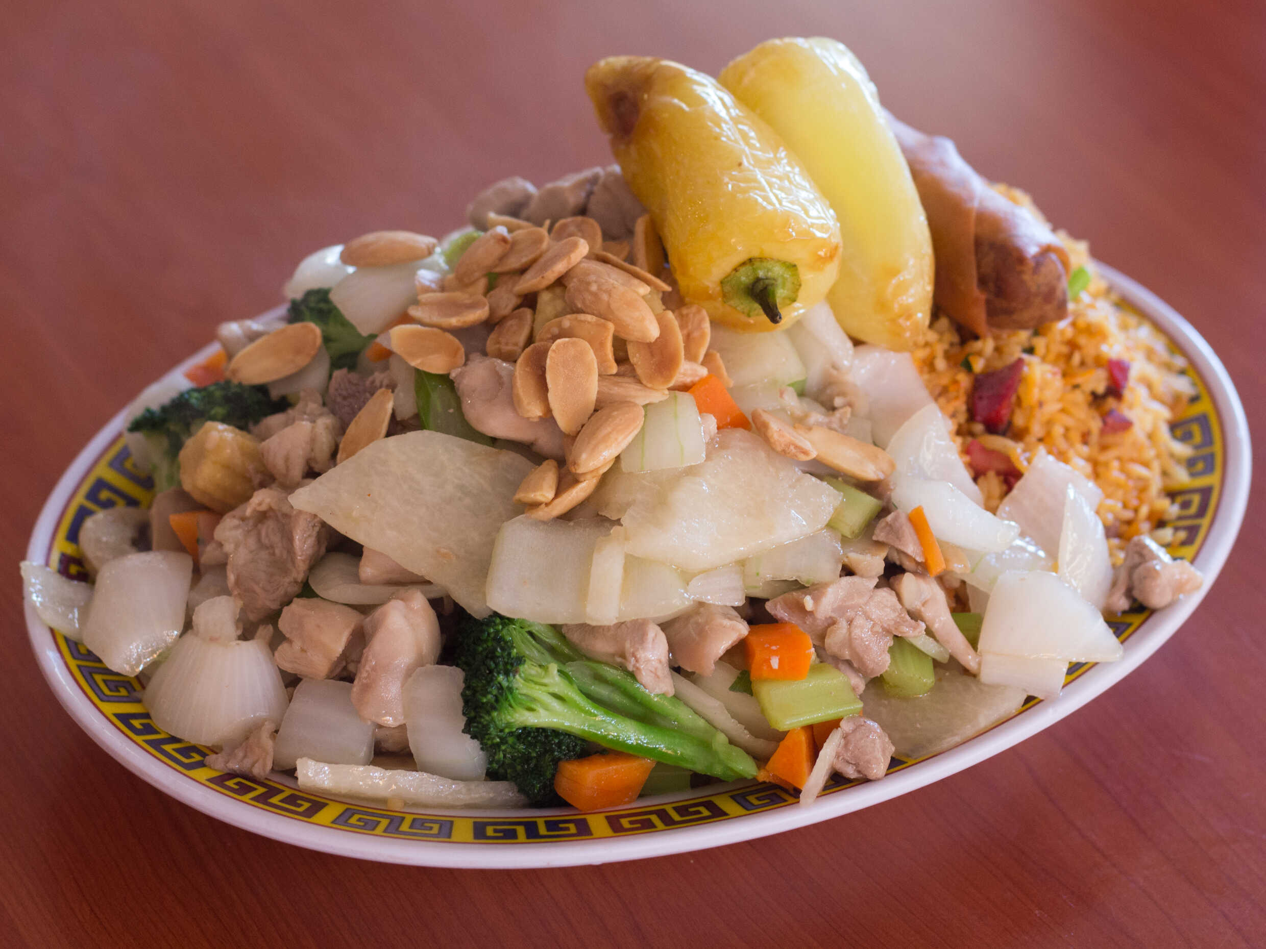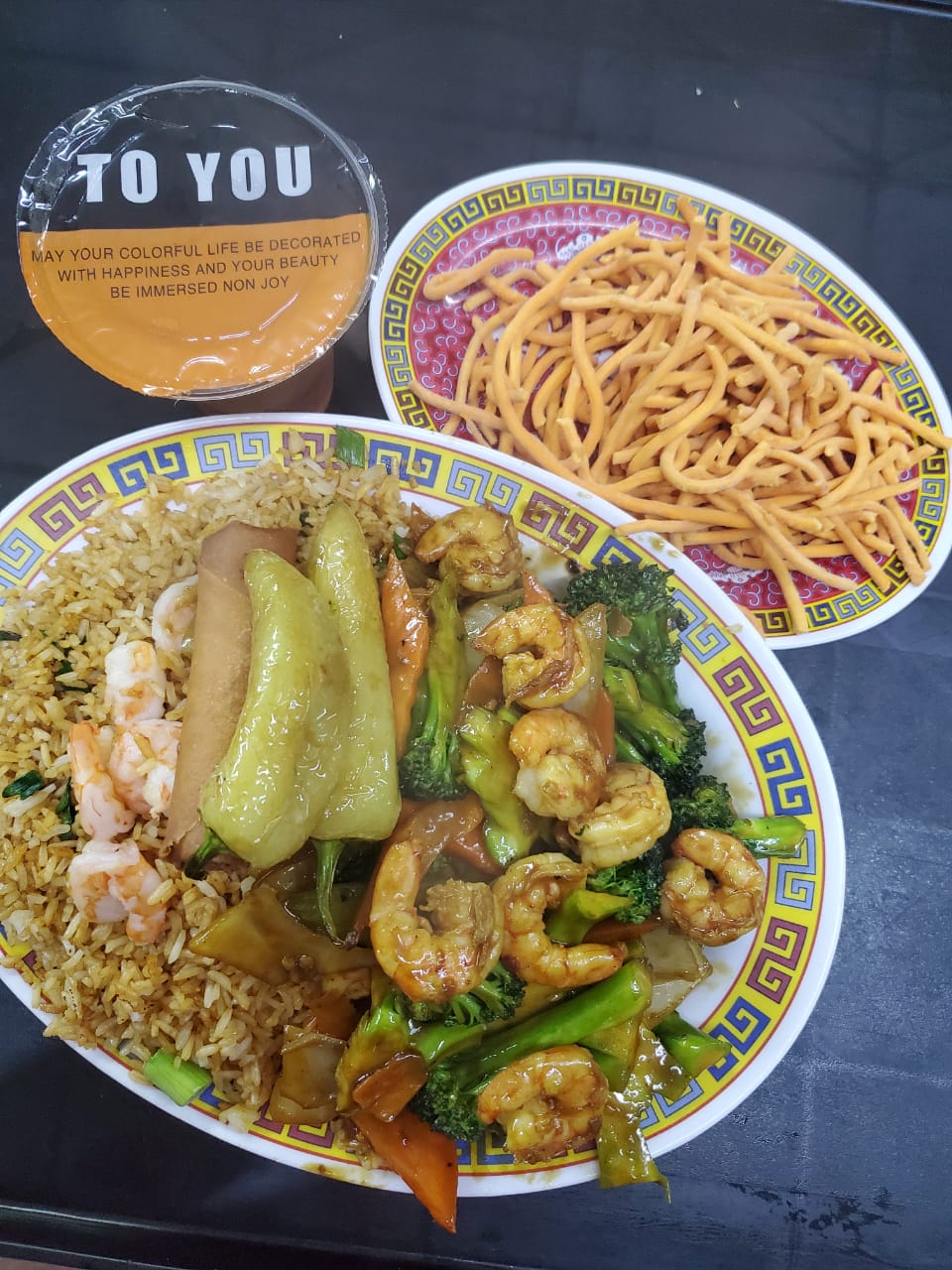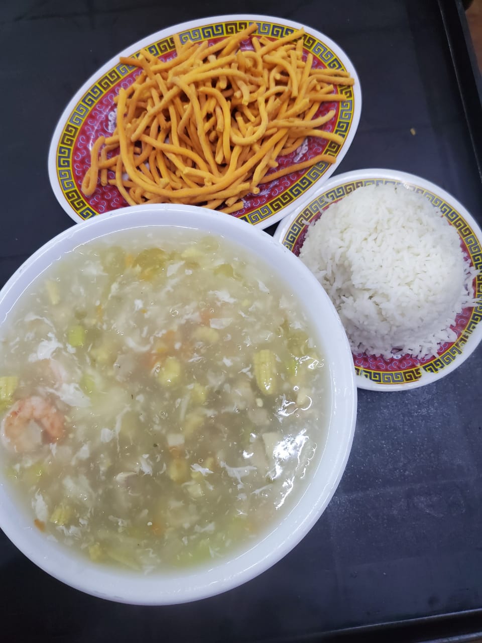 3 personas, caldo mandarin, pollo enchilado, camarones almendrados, res con brocoli, pollo con piña, polo asado, arroz cantones