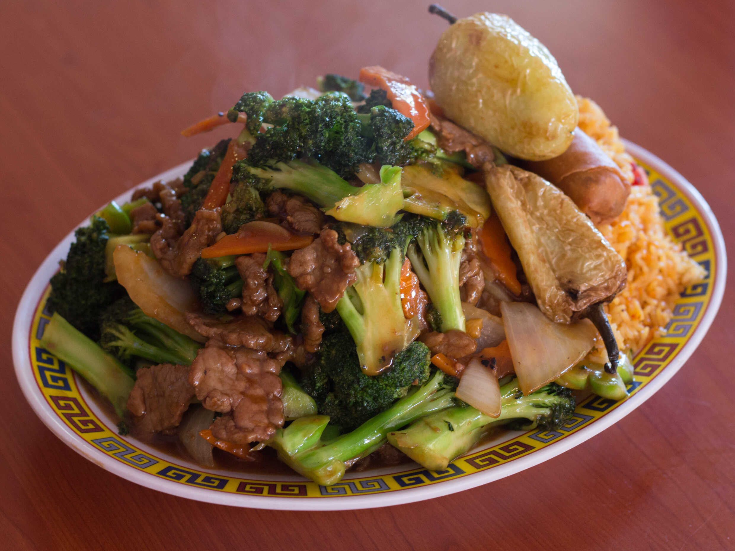 Res con Brocoli, arroz con puerco, chun kun, chile asado