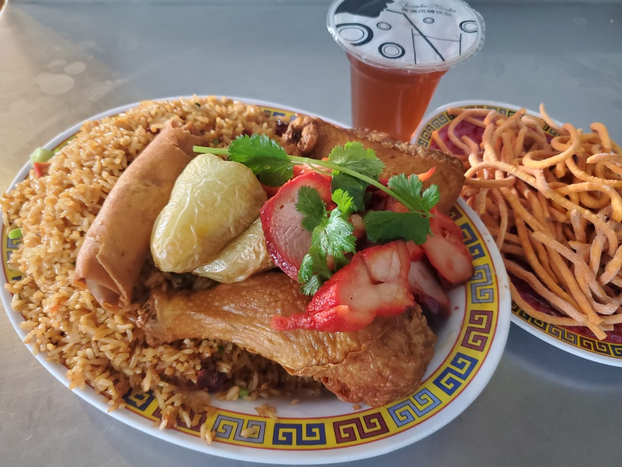 Chop suey de pollo, arroz con puerco, pollo asado y chun kun
