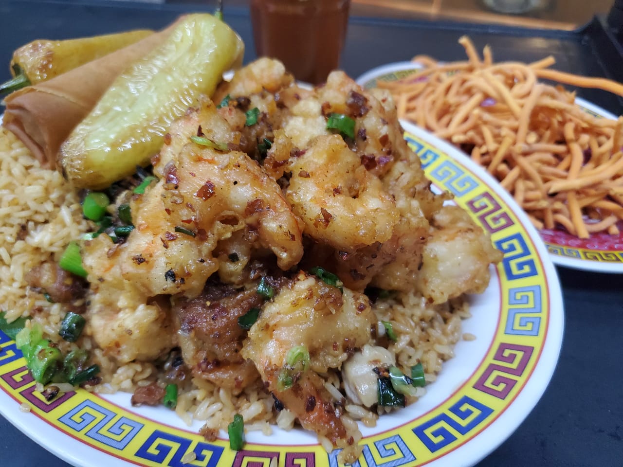 Camaron almendrado, arroz con camaron, chun kun, chile asado