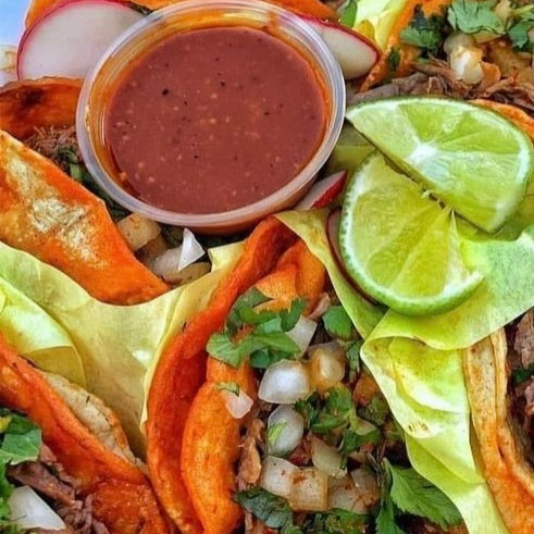 Tortilla de maíz, birria, cebolla, cilantro y salsa