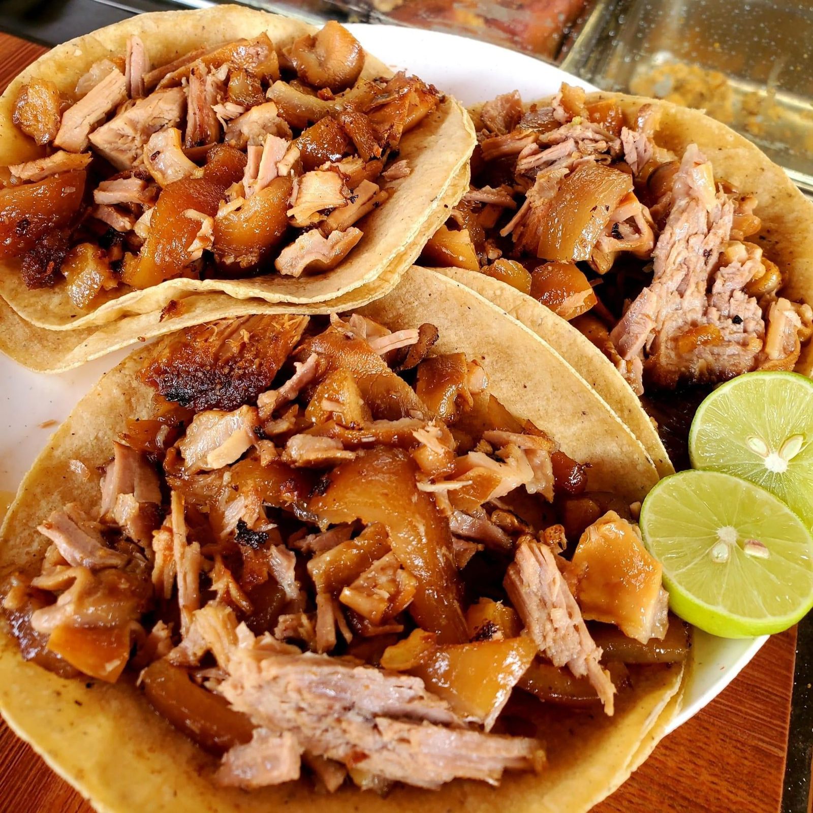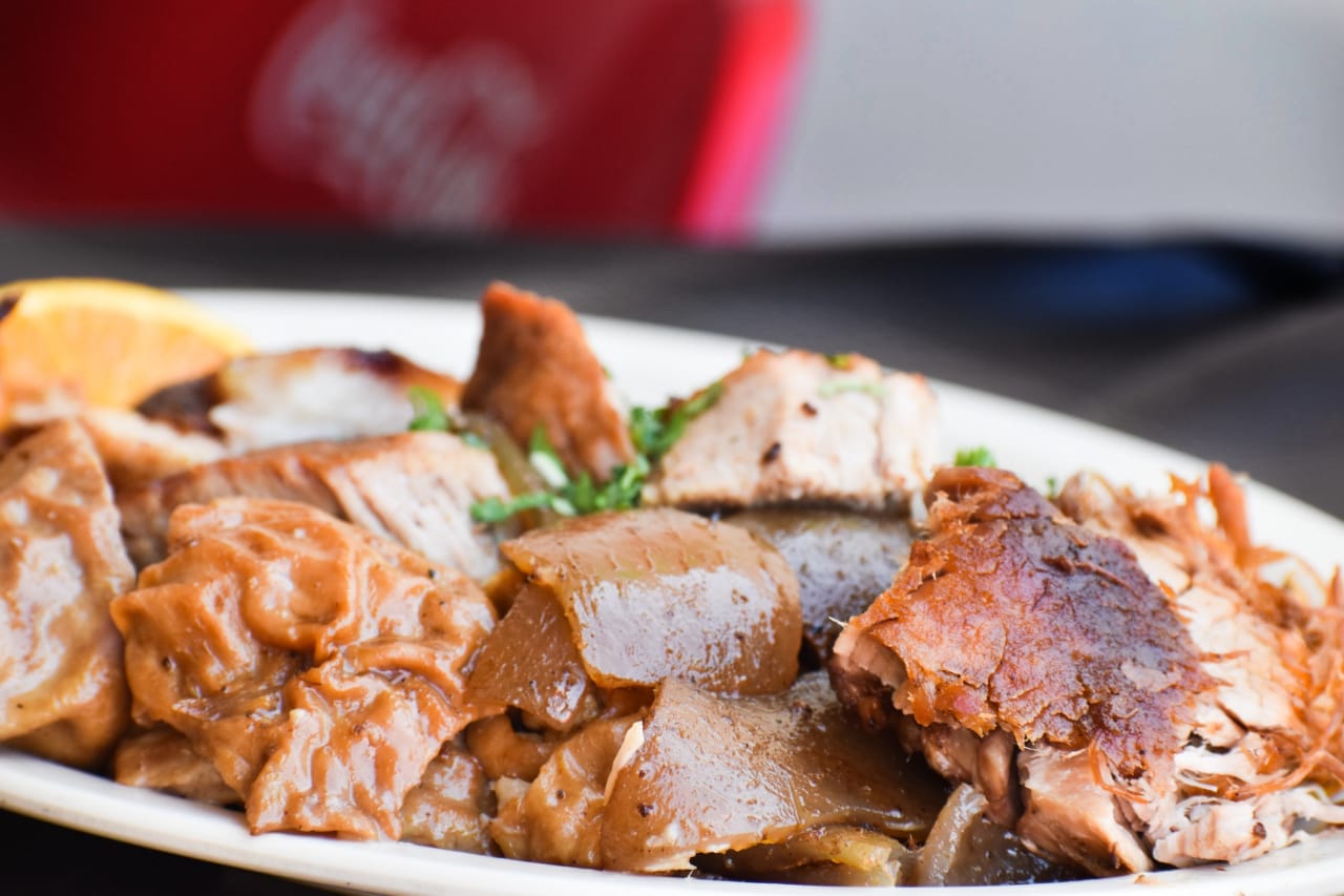 Elaborada de carnitas recién hechas servida con cebolla cilantro aguacate