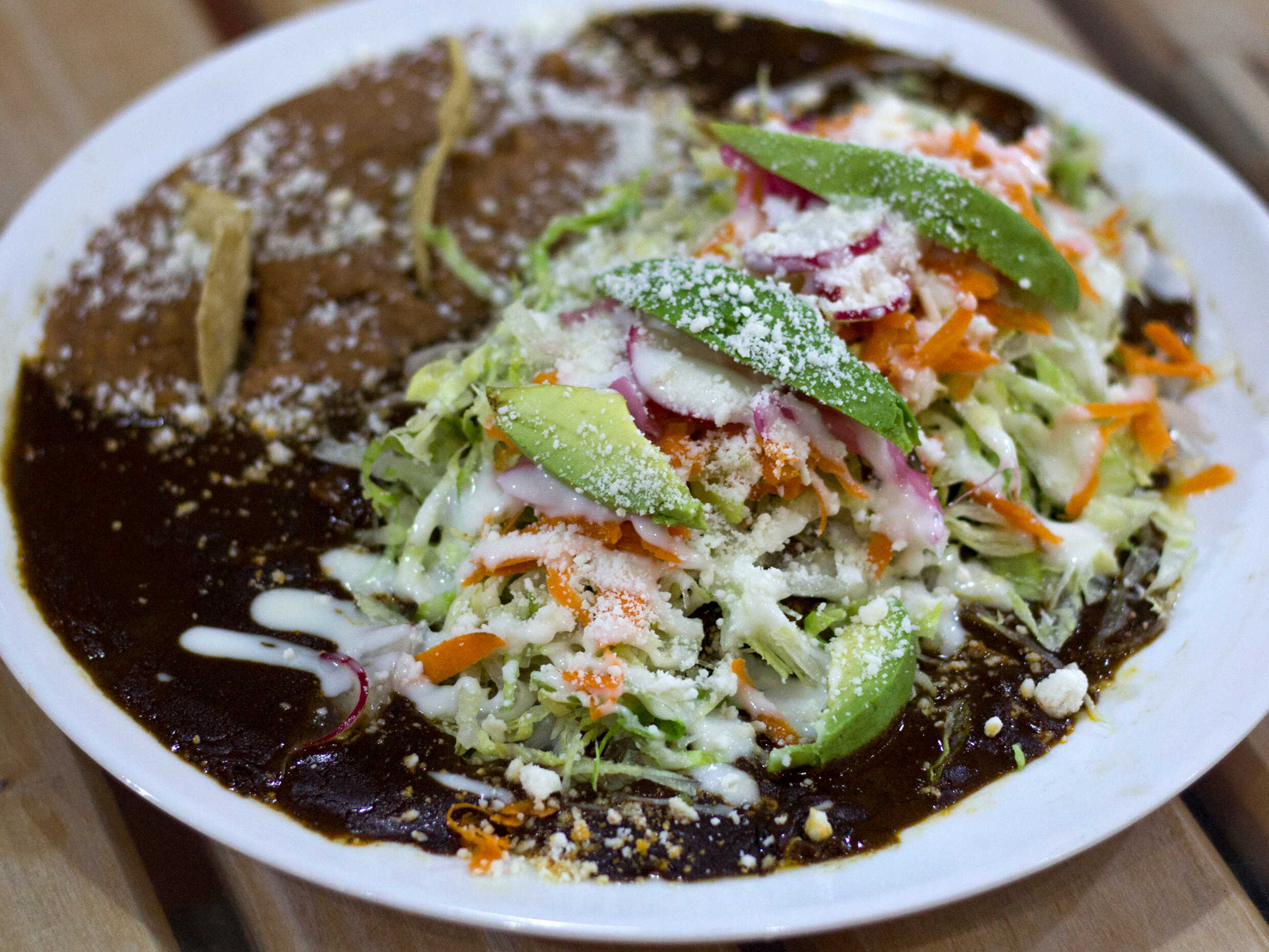 Cebolla, tomate, chile y queso bañado en salsa guajillo, frijol y papa al lado.