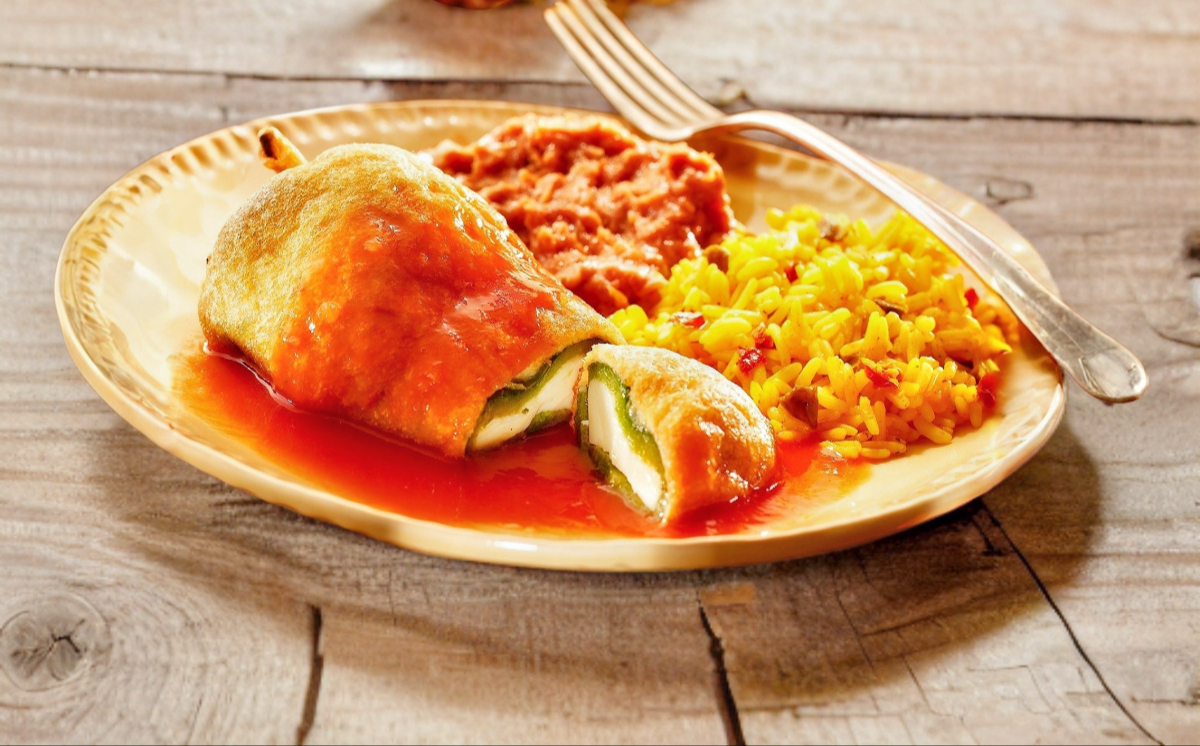 1 Chile relleno de queso monterrey con salsa, al lado frijol y arroz.