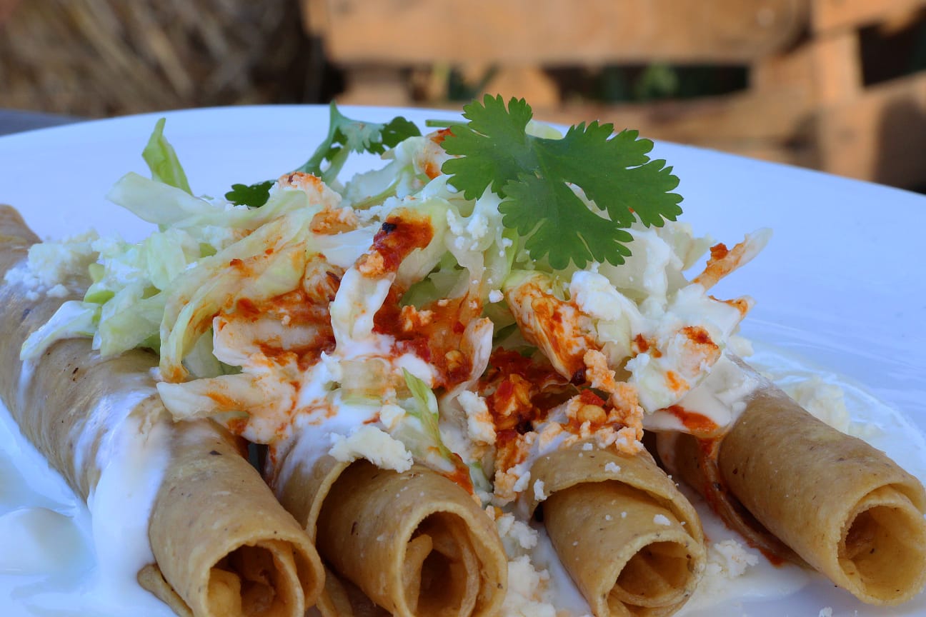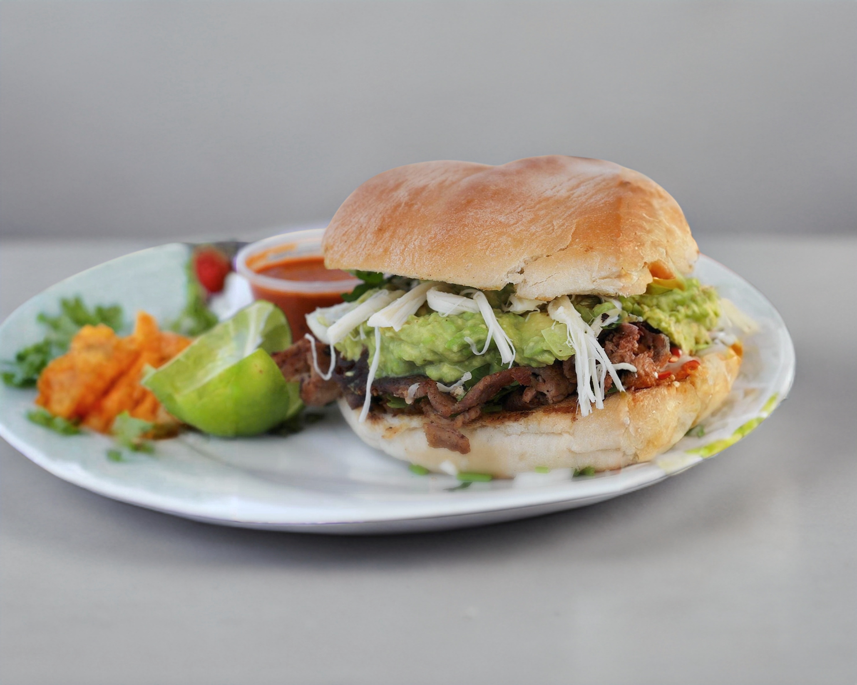 Acompañado de aderezo chipotle y mayonesa con crema, repollo y salsa bandera.
