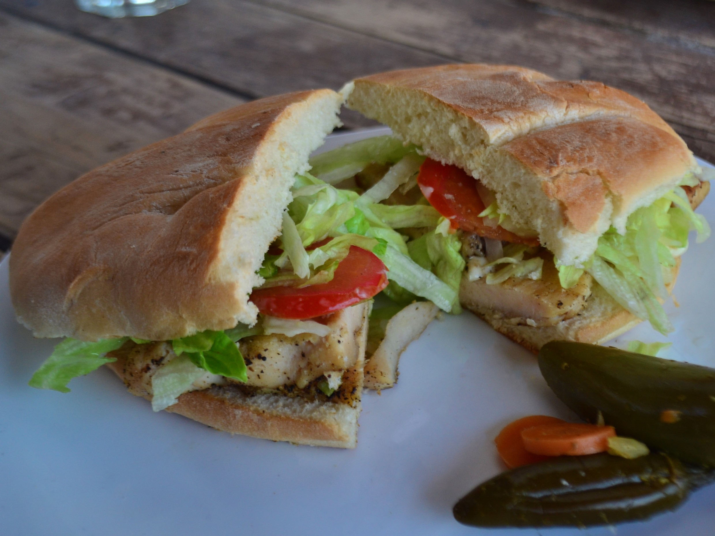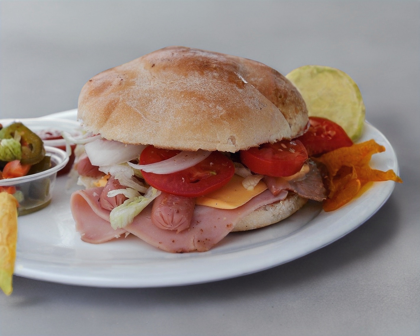 Pechuga de pollo, tocino, jamón, lechuga y tomate.