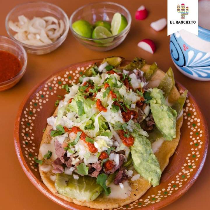 Tortilla crujiente, bañada con frijoles y cubierta con carne asada con queso oaxaca derretido, guacamole, salsa mexicana, crema y queso.