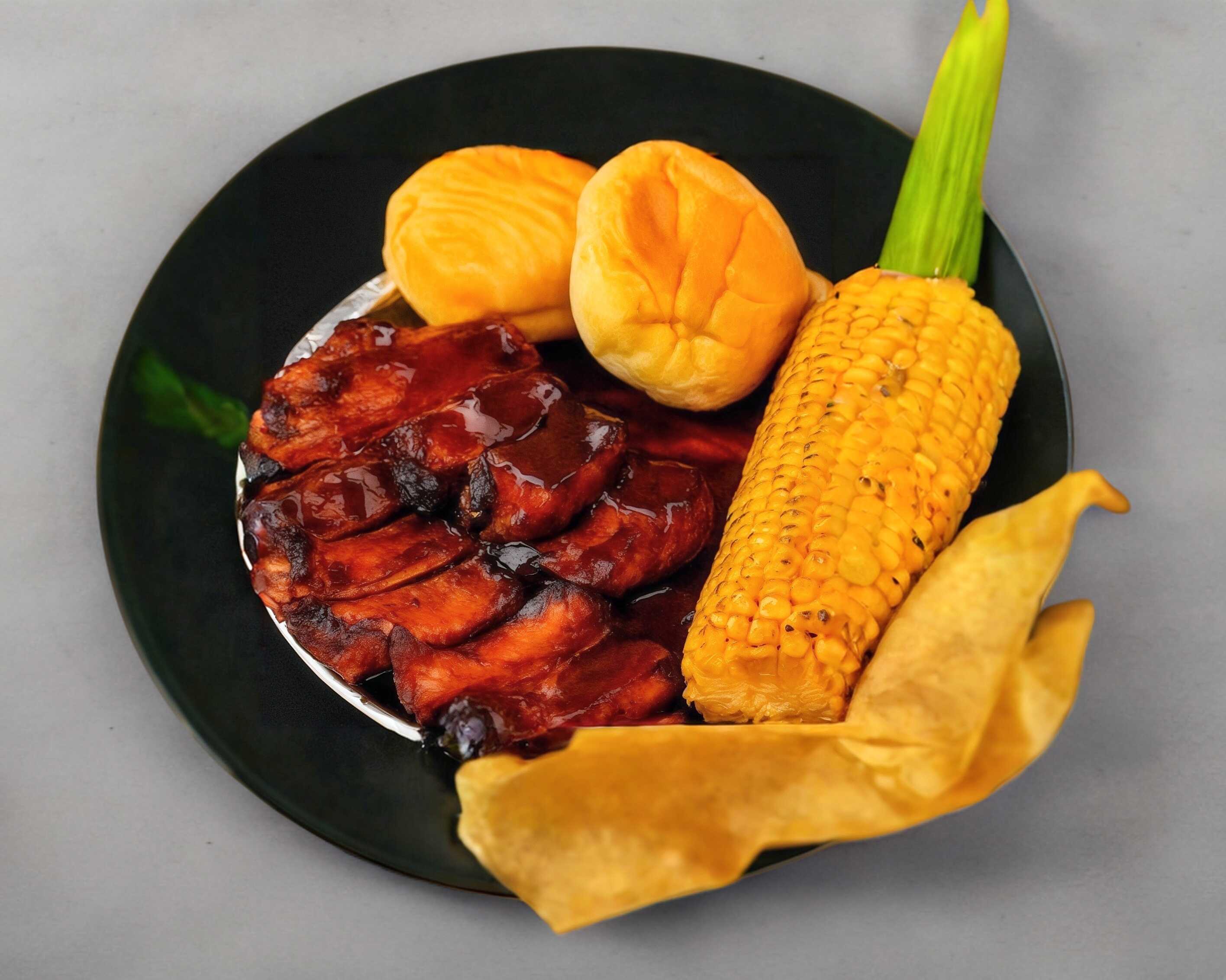 Costillas ahumadas con elote y pan y salsa de su bbq o bufalo