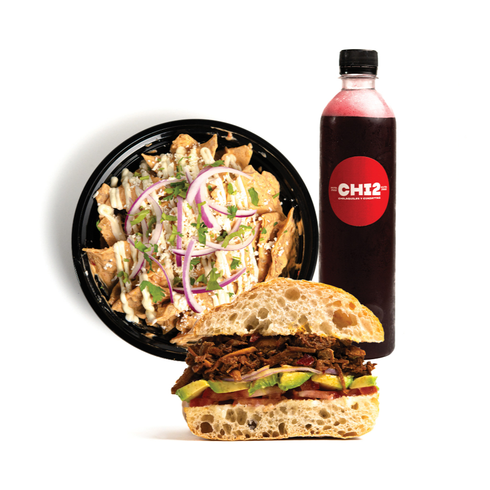 Es el combo de chi2, 1/2 chilaquiles 1/2 ciabatta y un agua a elegir.