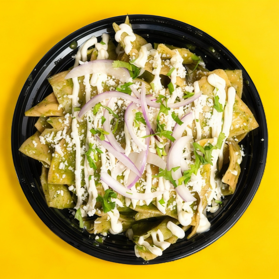 Platillo personal: Tacos bañados en salsa de tomatillo con chile jalapeño y serrano, servidos con cebolla, cilantro, queso Cotija y crema. Los que pican rico.