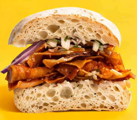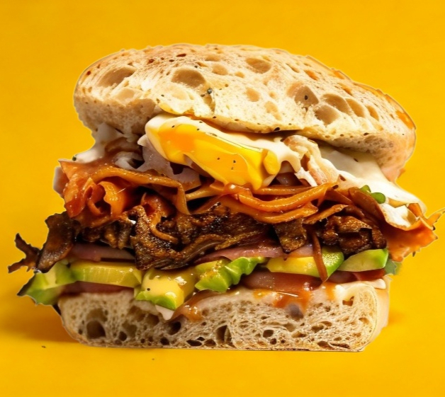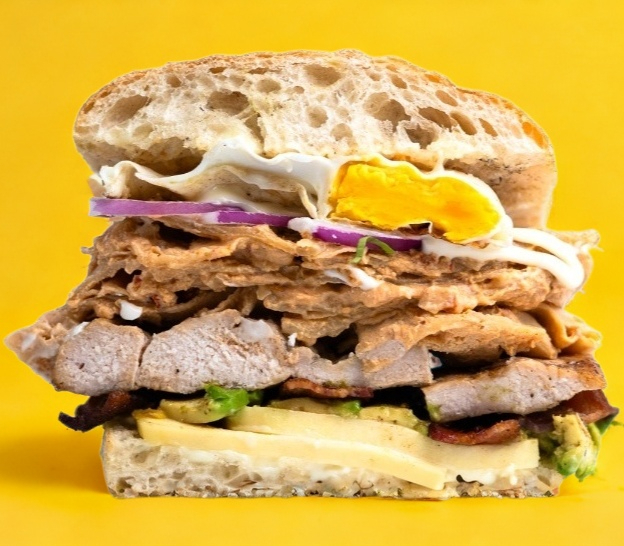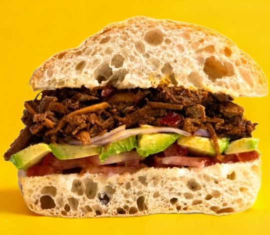 Lomo de puerco enchilado, tomate, cebolla morada y aguacate. Ciabatta sellada en la parrilla, pan tipo italiano.