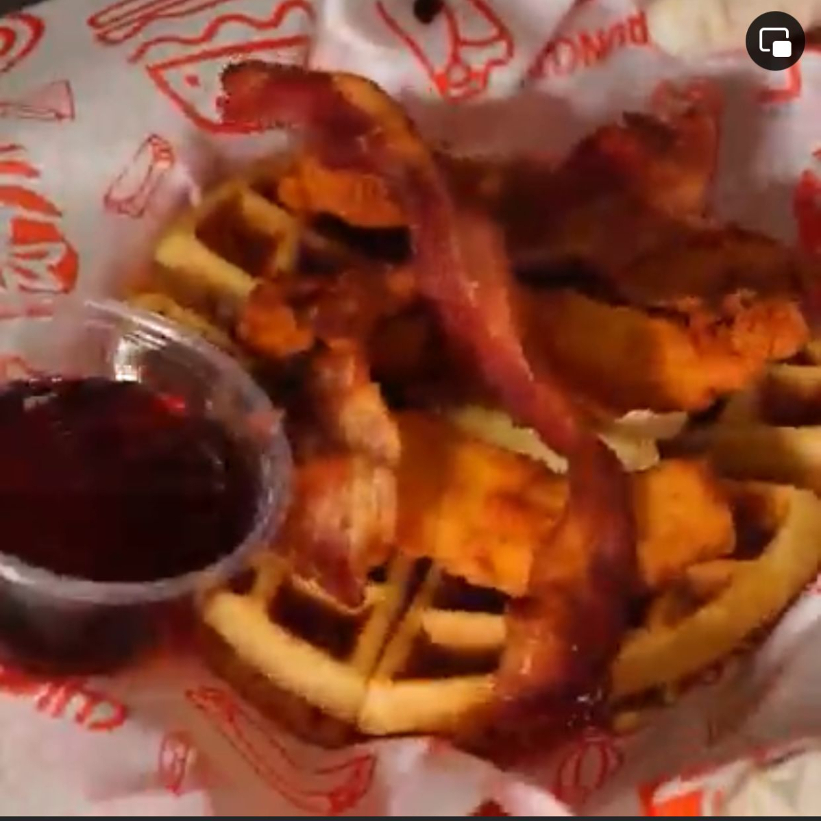Waffles de Mantequilla con Tenders, Tocino y Miel