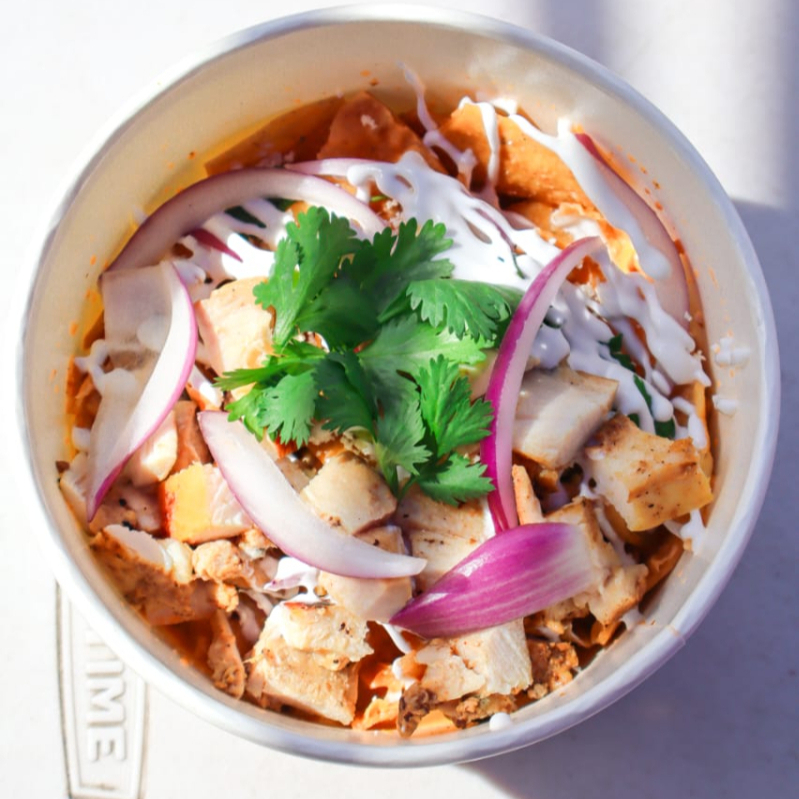 Chilaquiles salteados con tu salsa favorita y pollo a la plancha.