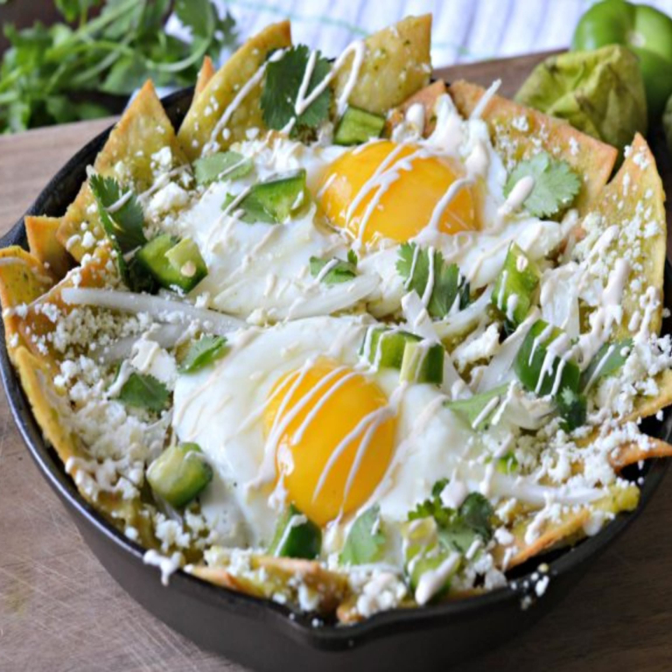 Chilaquiles salteados con tu salsa favorita y 2 huevos al gusto.