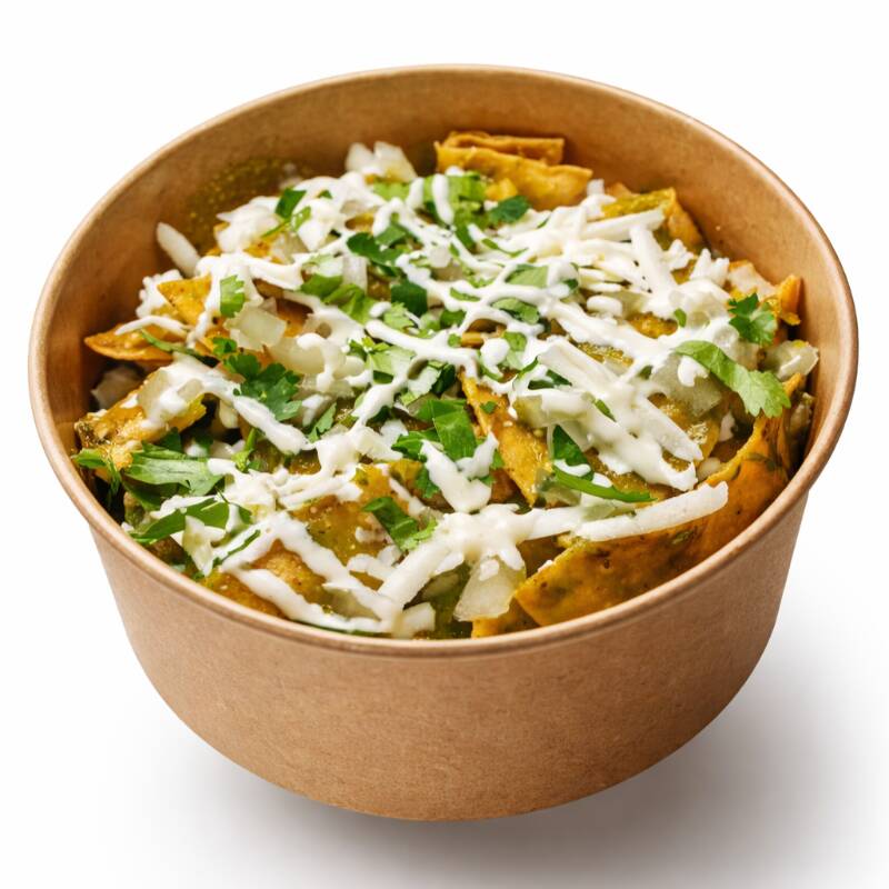 Chilaquiles rellenos de queso fundido cubiertos con cremosa salsa poblana de chile poblano, suave y llena de sabor. Incluyen toppings de cebolla, crema, cilantro y queso.