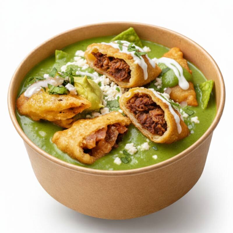 No son chilaquiles comunes, ¡están rellenos! Disfruta de 10 bocados crujientes rellenos de chicharrón prensado premium, sumergidos en nuestra receta secreta de salsa verde. Un equilibrio perfecto entre lo crujiente del maíz y la suavidad del relleno.