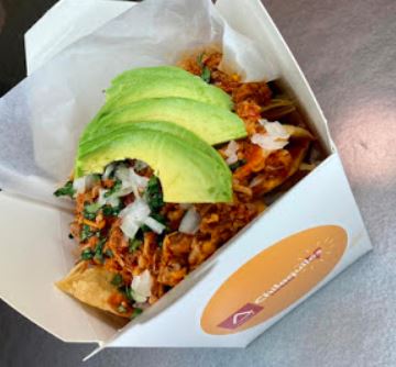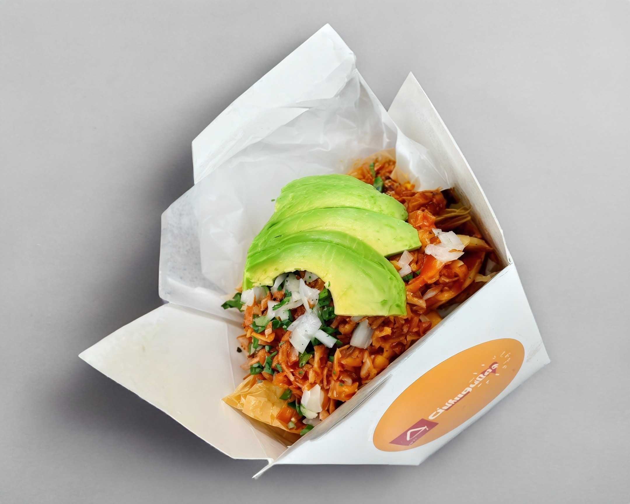 Totopo crujiente, salsa, proteína, queso, crema, cilantro y cebolla.