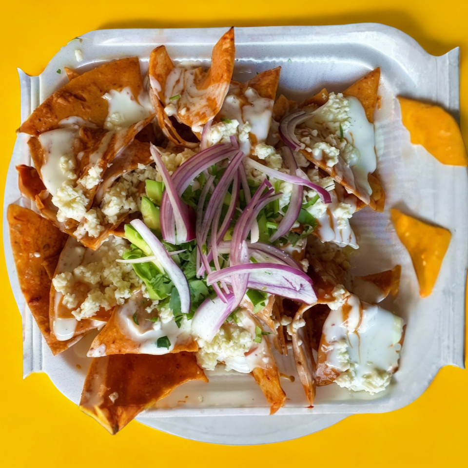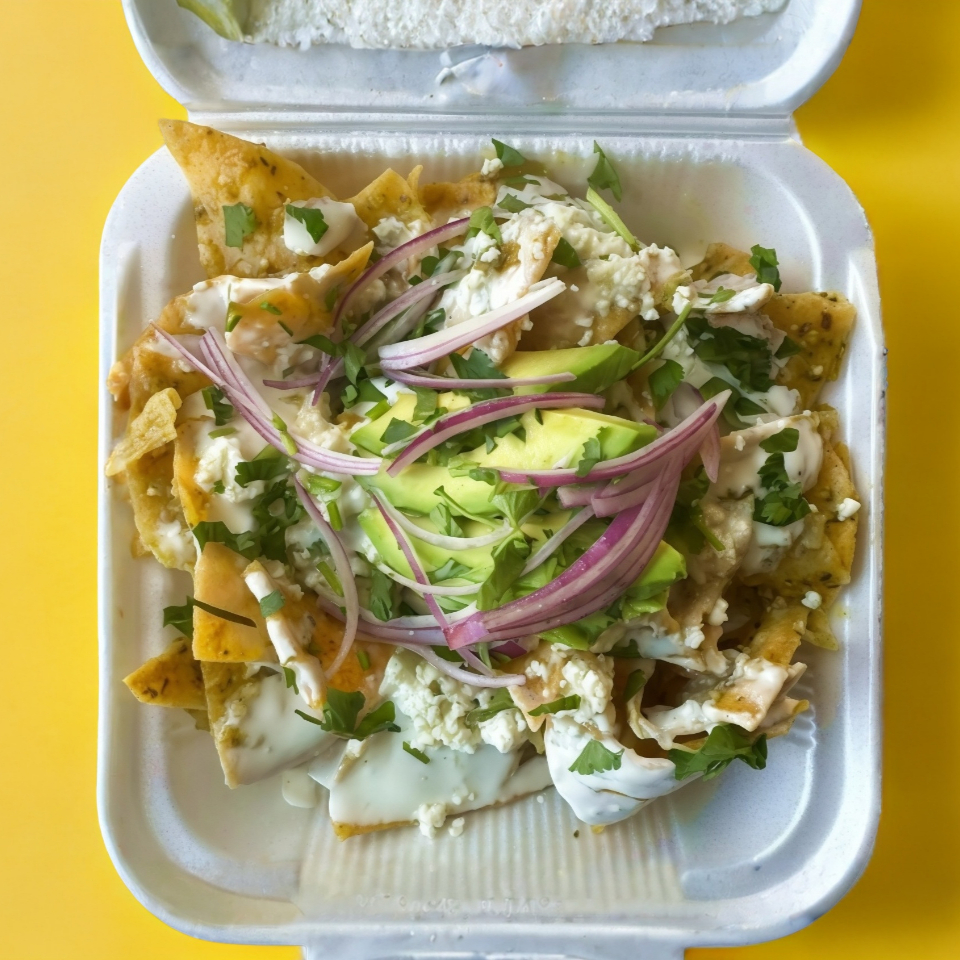 Chilaquiles en salsa roja, incluyen crema, queso fresco, aguacate, cebolla y cilantro, acompañado de frijoles y 2 huevos revueltos con jamón.