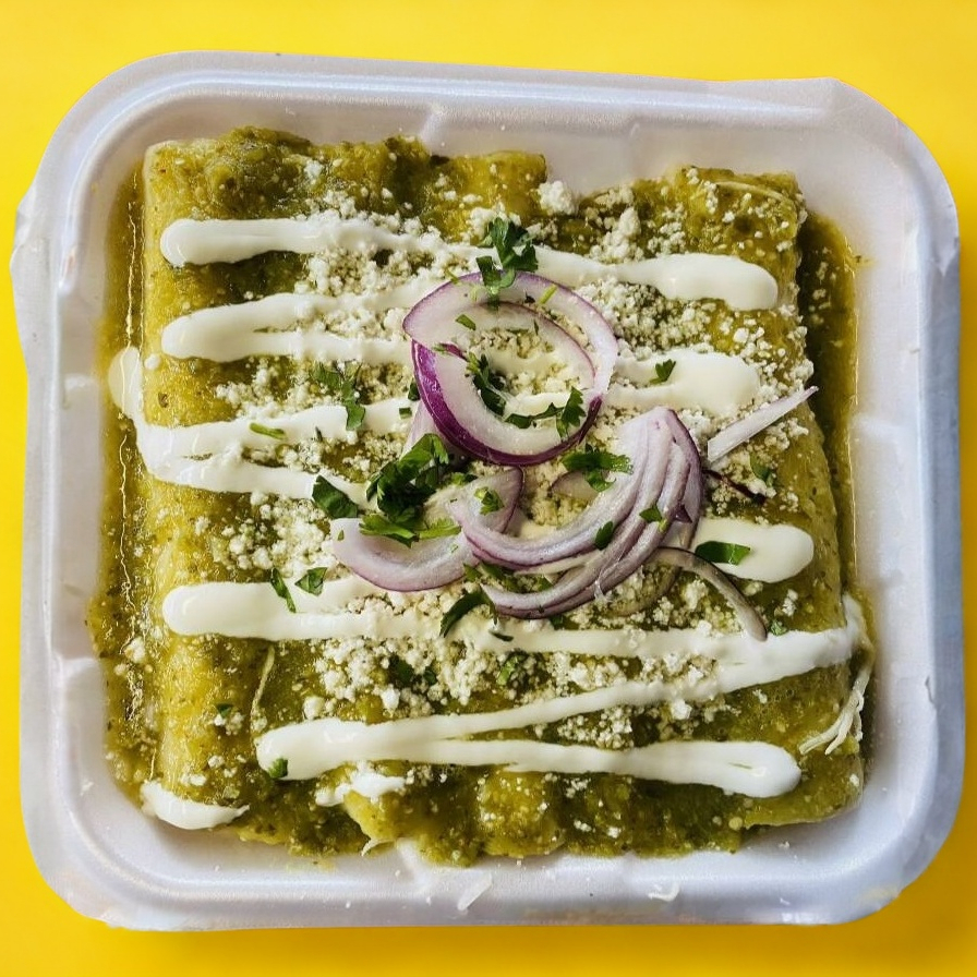 5 enchiladas verdes rellenas de pollo, acompañadas de lechuga, cebolla, queso y crema.