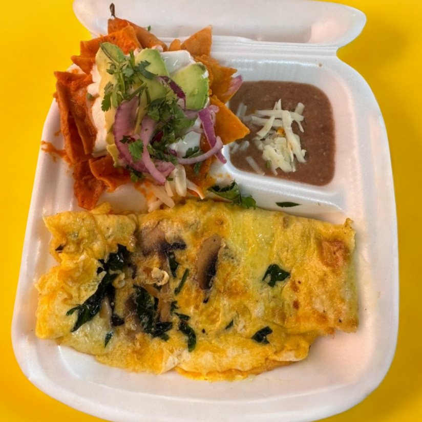 Omelette con champiñones y espinacas, acompañado de frijoles y chilaquiles rojos.