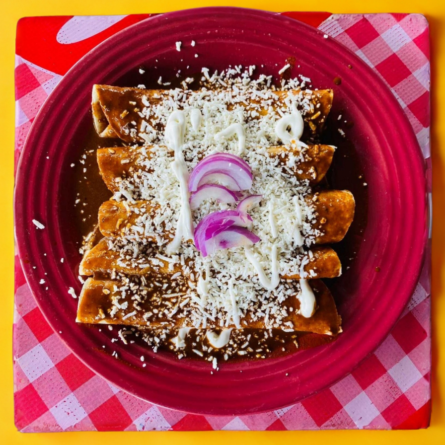 5 enmoladas de pollo, rellenas de pollo, cebolla, queso seco y bañadas en mole, crema, queso y cebolla.