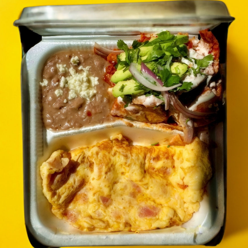 Omelette de queso y jamón, acompañado de frijoles y chilaquiles rojos.