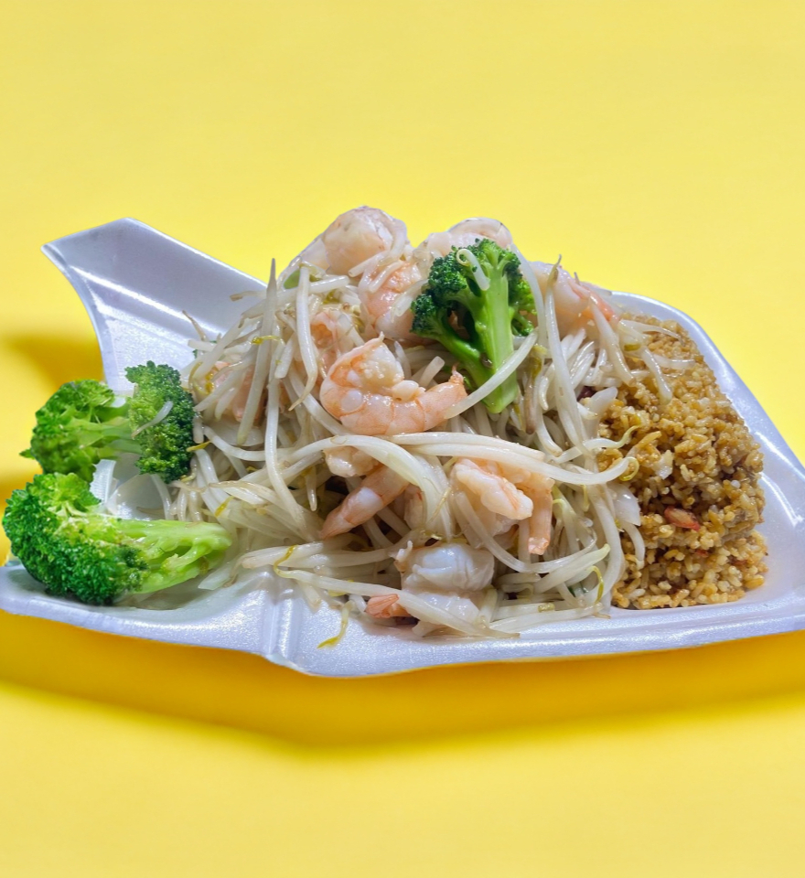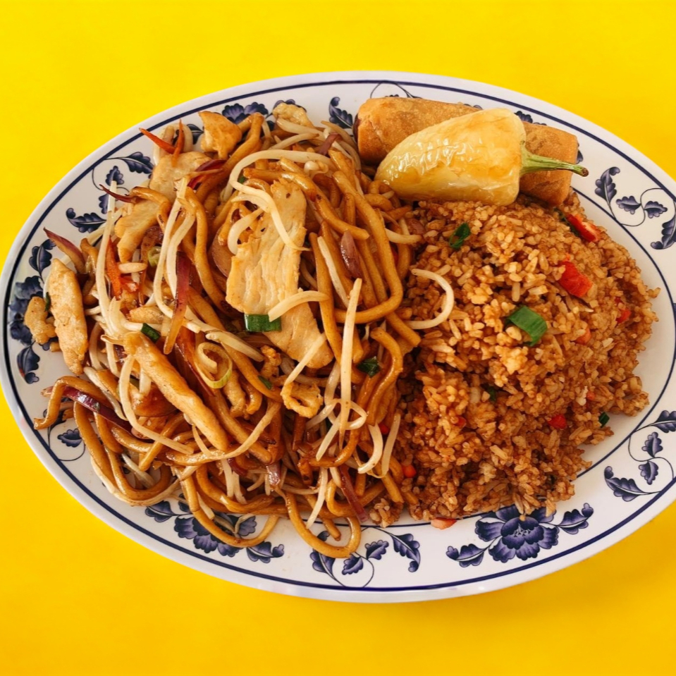 Caldo noodle cantones + chp suey con camarón + pollo cantones + pollo frito + arroz cantones