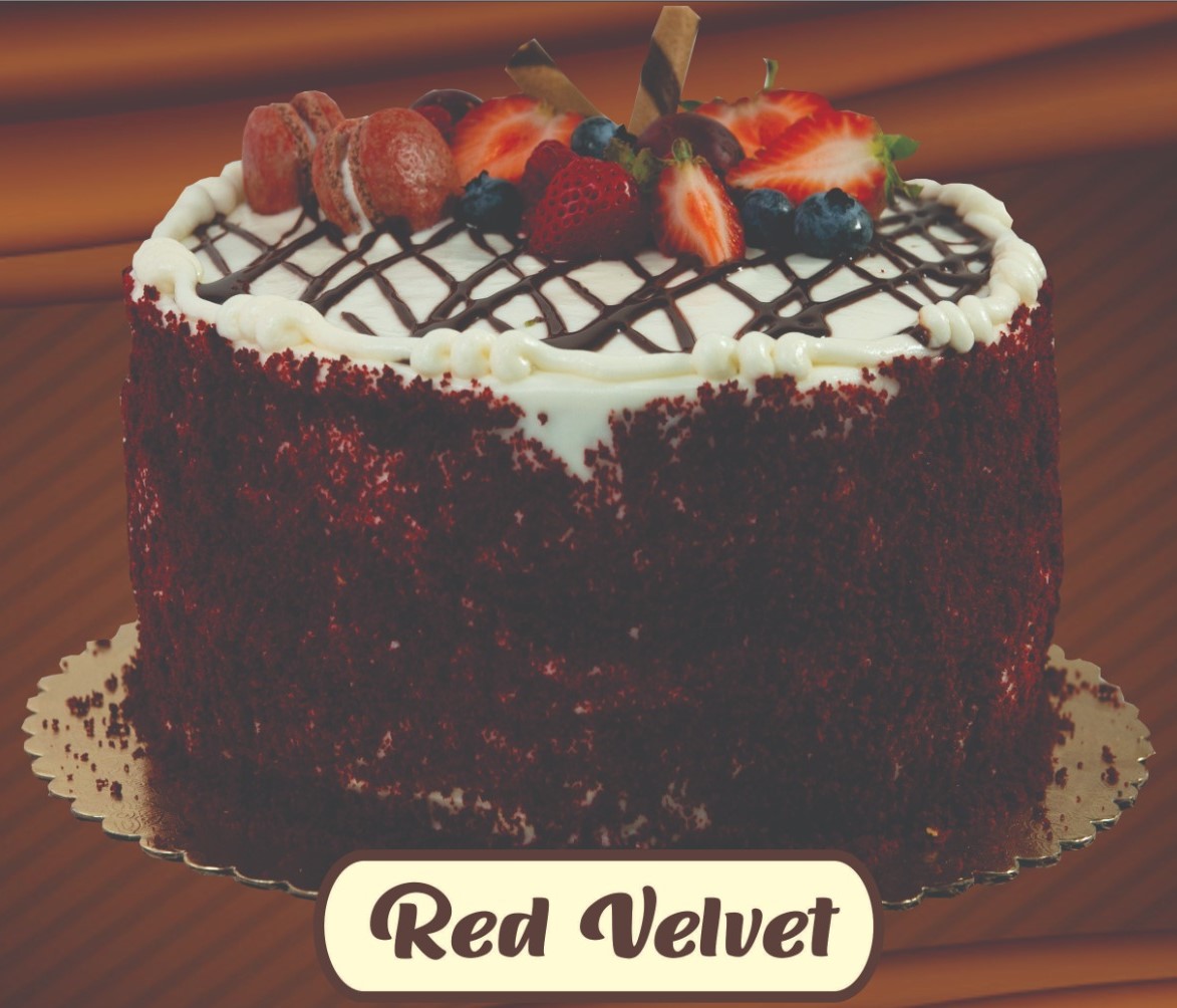 3 Capas de red velevet relleno de queso crema y jarabe natural.