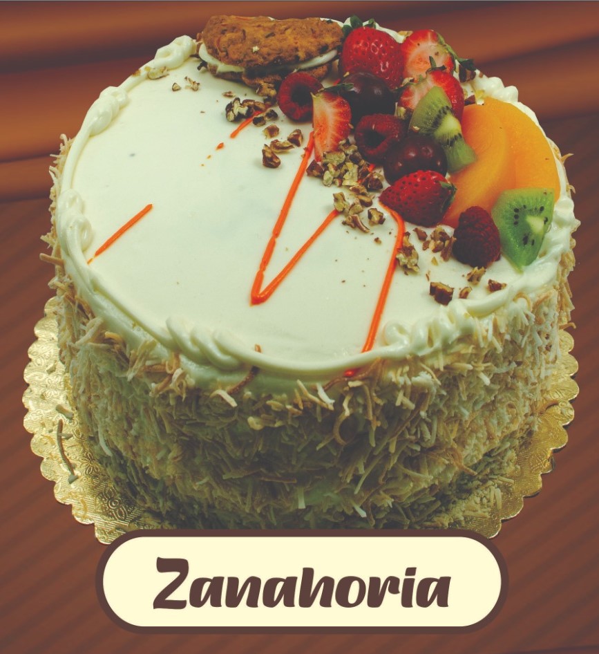 2 Capas de pan de zanahoria, con pasas, coco, piña, nuez y creso crema, para 10 a 12 personas.