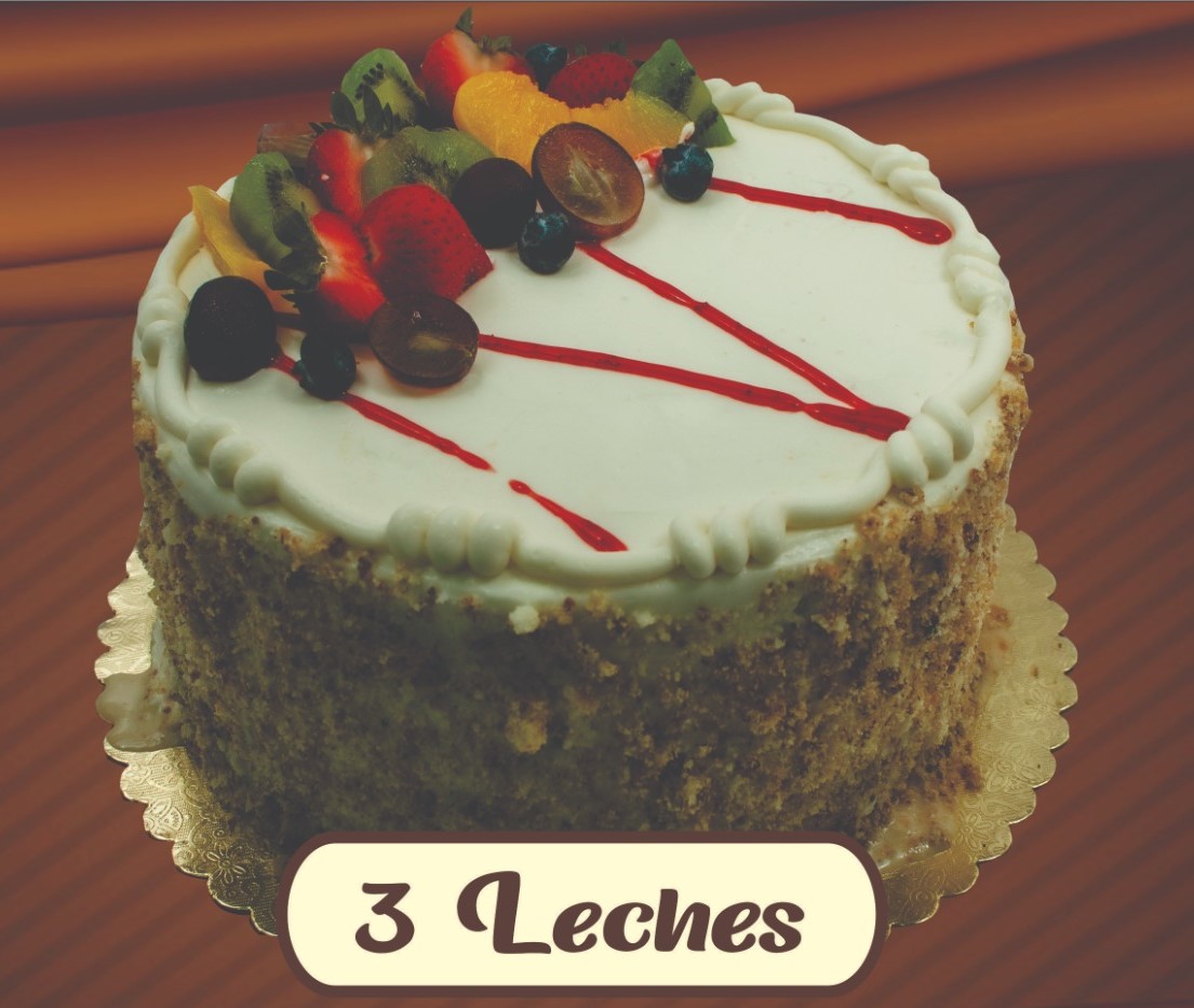 3 Capas de pan de vainilla, rellena con fresa, crema de queso, nuez, env con jarabe 3 leches.
