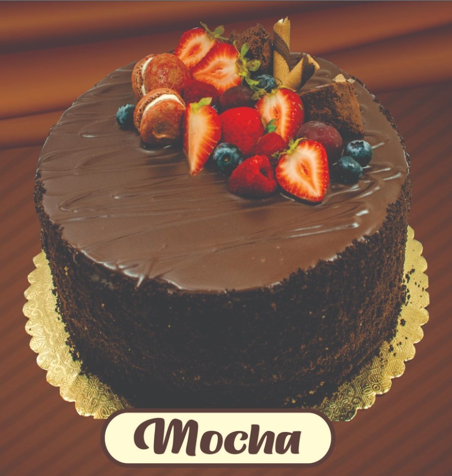 4 Capas de pan en chocolate env con café, 2 rellenos mousse de chocolate y 1 de café bañado con chocolate, para 10 o 12 personas.