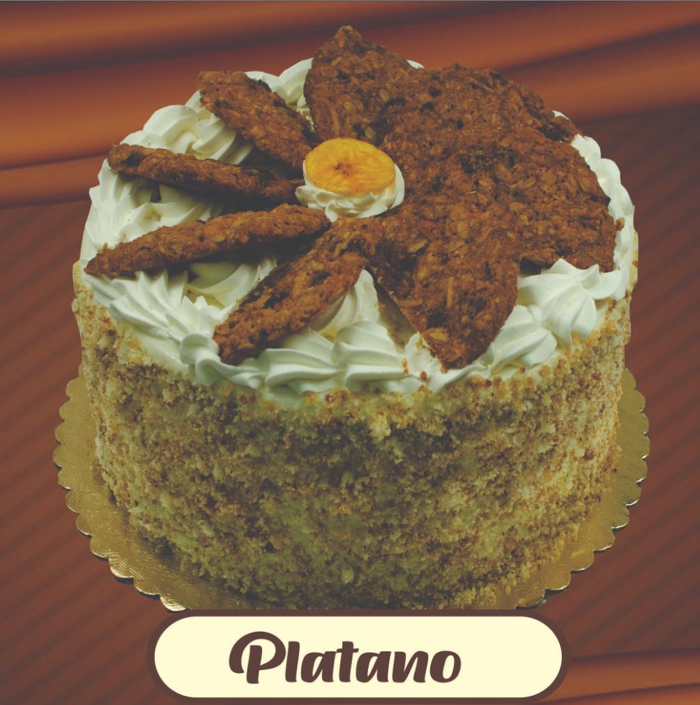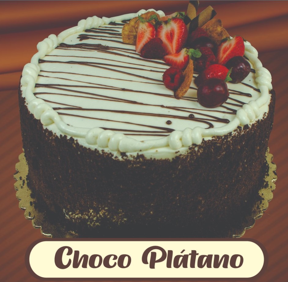 1 Capa de pan chocolate y 1 de plátano, relleno con plátano natural, crema de queso con nuez, para 10 a 12 personas.