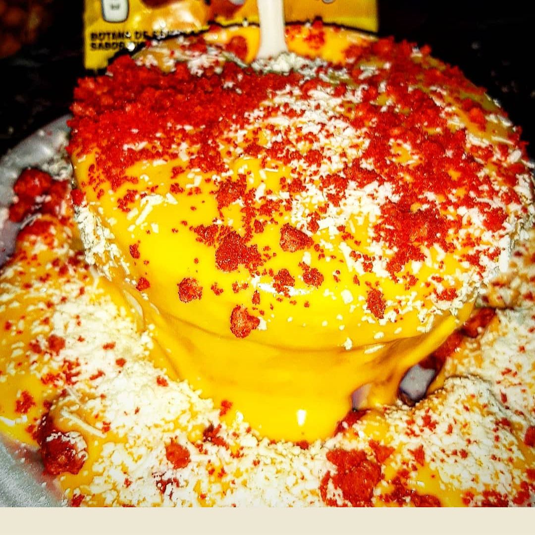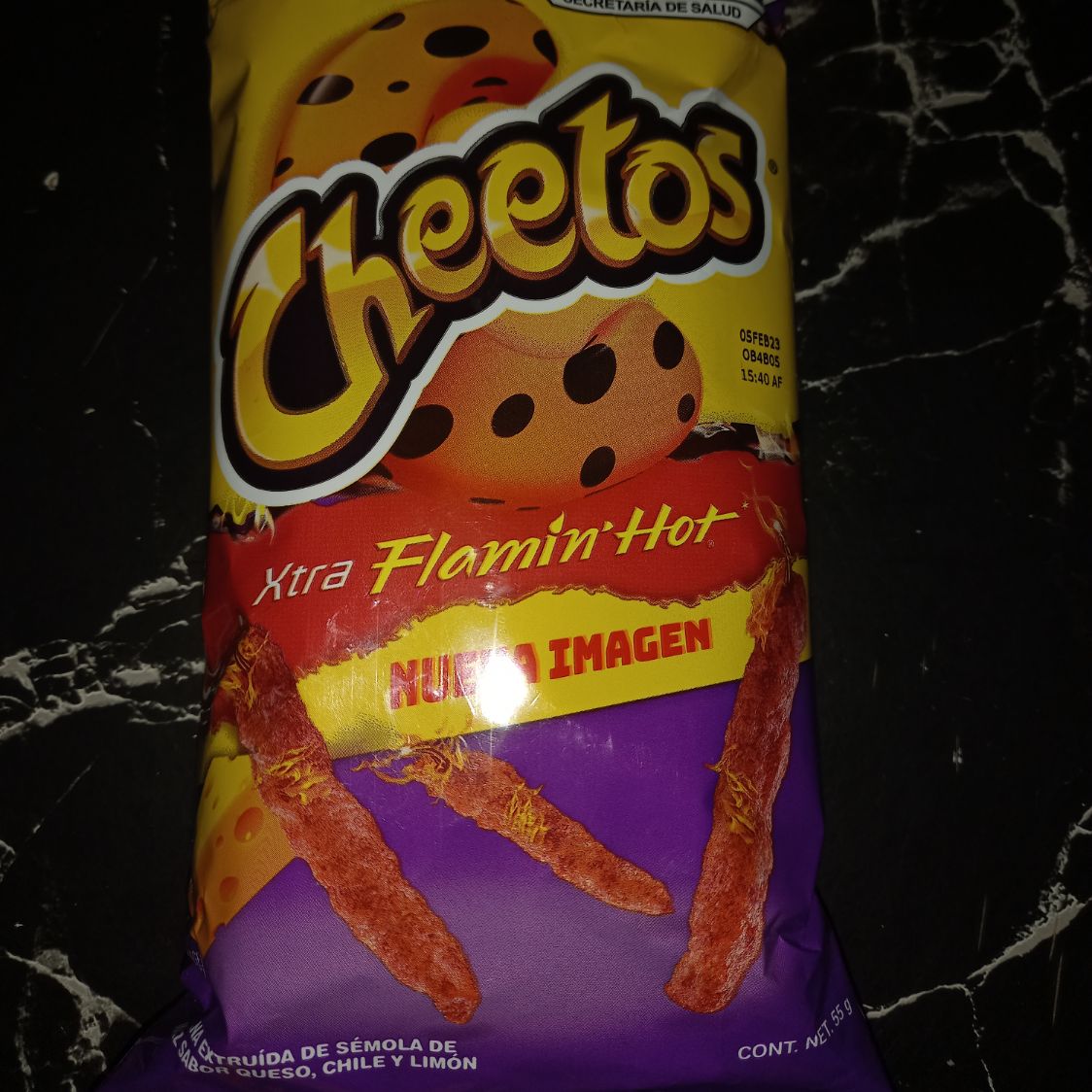 Cheetos flamin, jicama, pepino, cuerito, cacahuate, chacachaca, salsa, chamoy, limon, tajin y clamato.