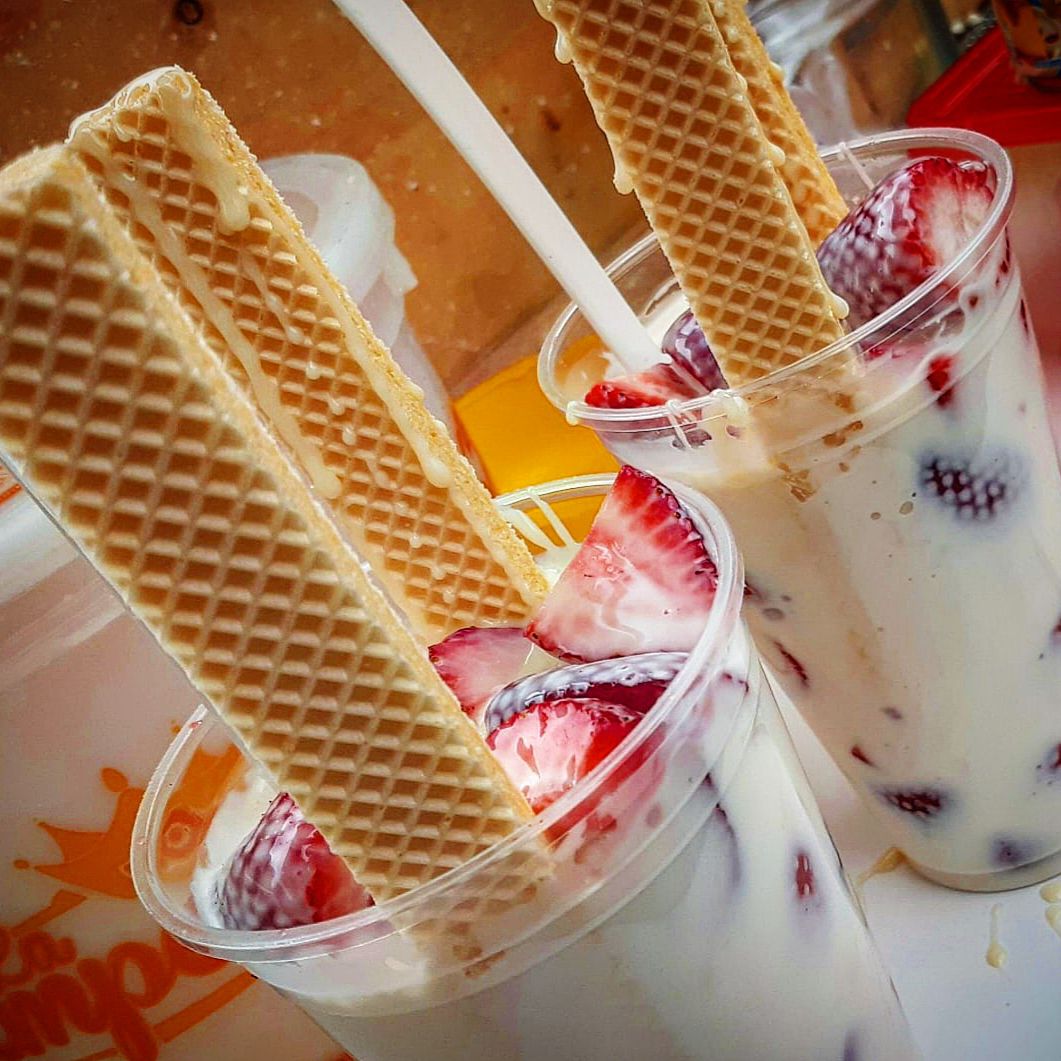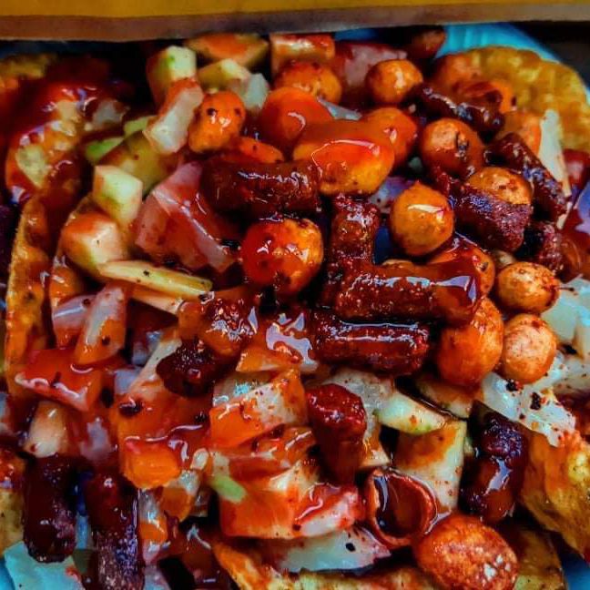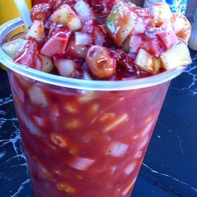 Tostito, pepino, salchicha, cueritos, cacahuate, chacachaca, salsa, chamoy, tajin, limon y clamato.(va servido en un vaso de litro).