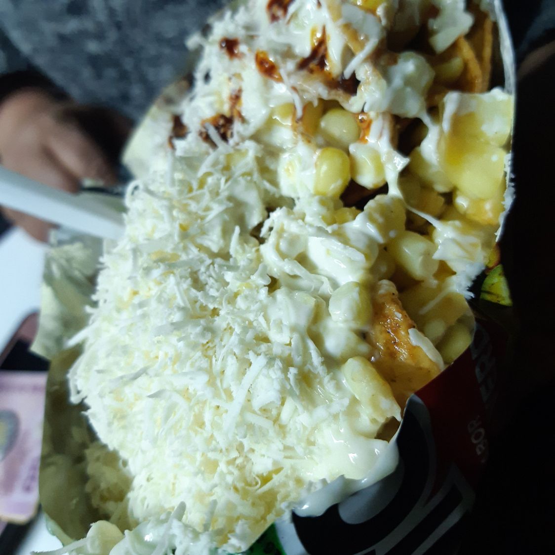 Charola con maruchan en medio rellena de esquite, mayonesa y queso seco, alrededor sabritas y chorreado todo con queso para nachos.