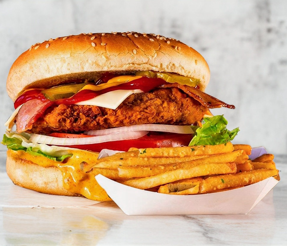 Pechuga de pollo spicy con tocino crujiente, queso suizo, lechuga fresca, tomate, cebolla y pepinillos. Coronada con cátsup, mostaza y aderezo City Burger. ¡Un clásico con un toque picante que nunca falla!