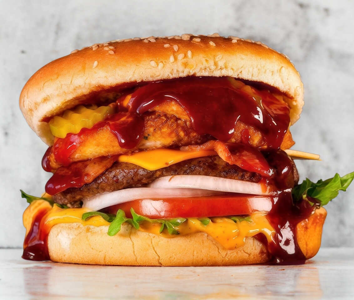 Carne de res y pechuga de pollo spicy, combinadas con aderezo ranch, queso amarillo y queso suizo. Acompañada de lechuga fresca, tomate, pepinillos y coronada con cátsup, mostaza y aderezo City Burger. ¡Una mezcla perfecta de sabores en un solo bocado!