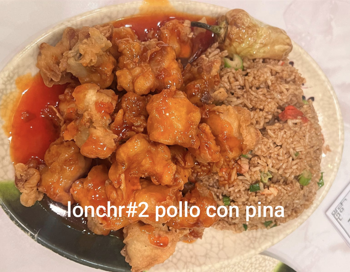 Caldo pollo, arroz cantonés, chop suey de pollo, pollo con piña, pollo cantonés, pollo asado y carnitas de puerco.